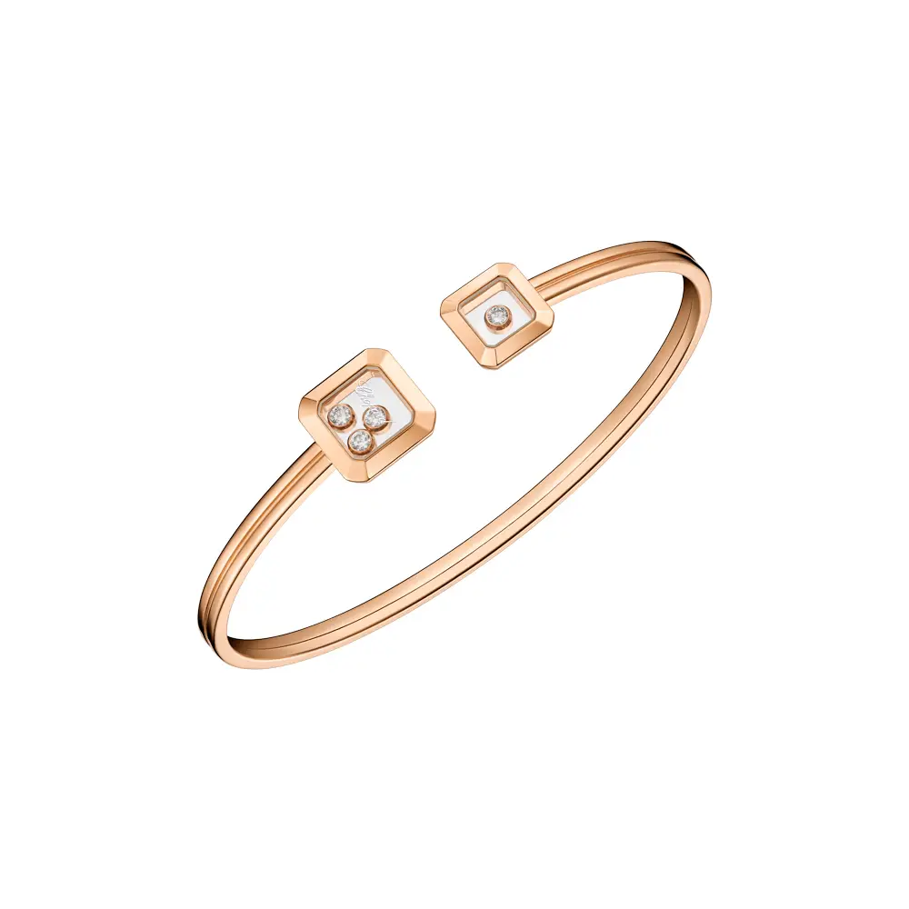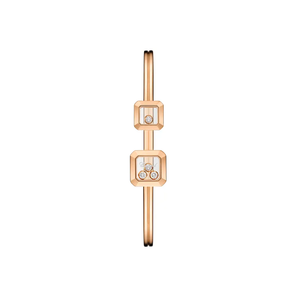 Vòng tay được nạm 4 viên kim cương tổng cộng 0,20 carat, được chế tác tỉ mỉ để tạo nên vẻ lấp lánh tự nhiên. Thiết kế độc đáo này thể hiện tay nghề thủ công tuyệt vời của Chopard và triết lý joie de vivre – niềm vui trong từng khoảnh khắc.