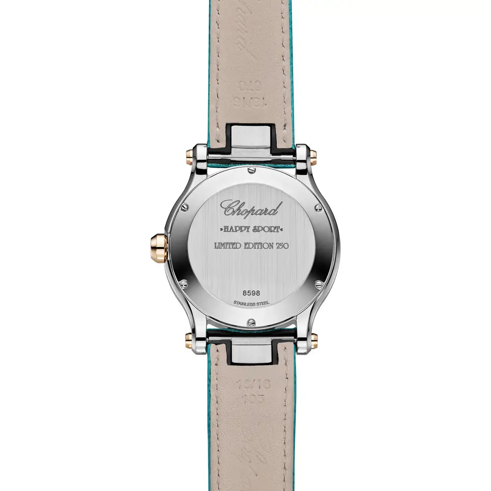 Chopard Happy Fish 278598-6001 là một mẫuđồng hồ đặc biệt thuộc bộ sưu tập Happy Sport nổi tiếng, kết hợp giữa nghệ thuật chế tác đồng hồ tinh xảo và nét tinh nghịch của thế giới đại dương. Vỏ đồng hồ có đường kính 36mm được làm từ thép không gỉ Lucent Steel™, đi kèm với vành bezel và núm vặn bằng vàng hồng 18k có nguồn gốc đạo đức. Toàn bộ được bảo vệ bởi kính sapphire có lớp chống phản chiếu và hoàn thiện với nắp lưng trong suốt.