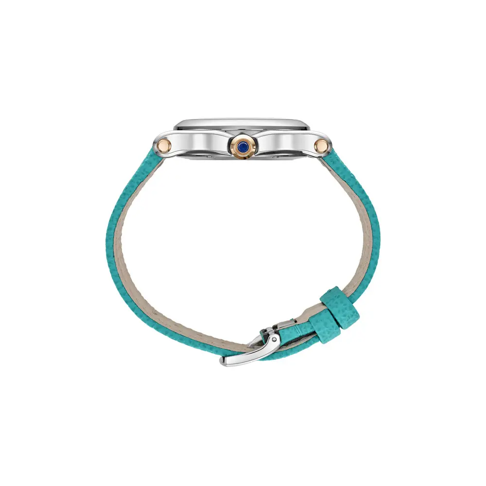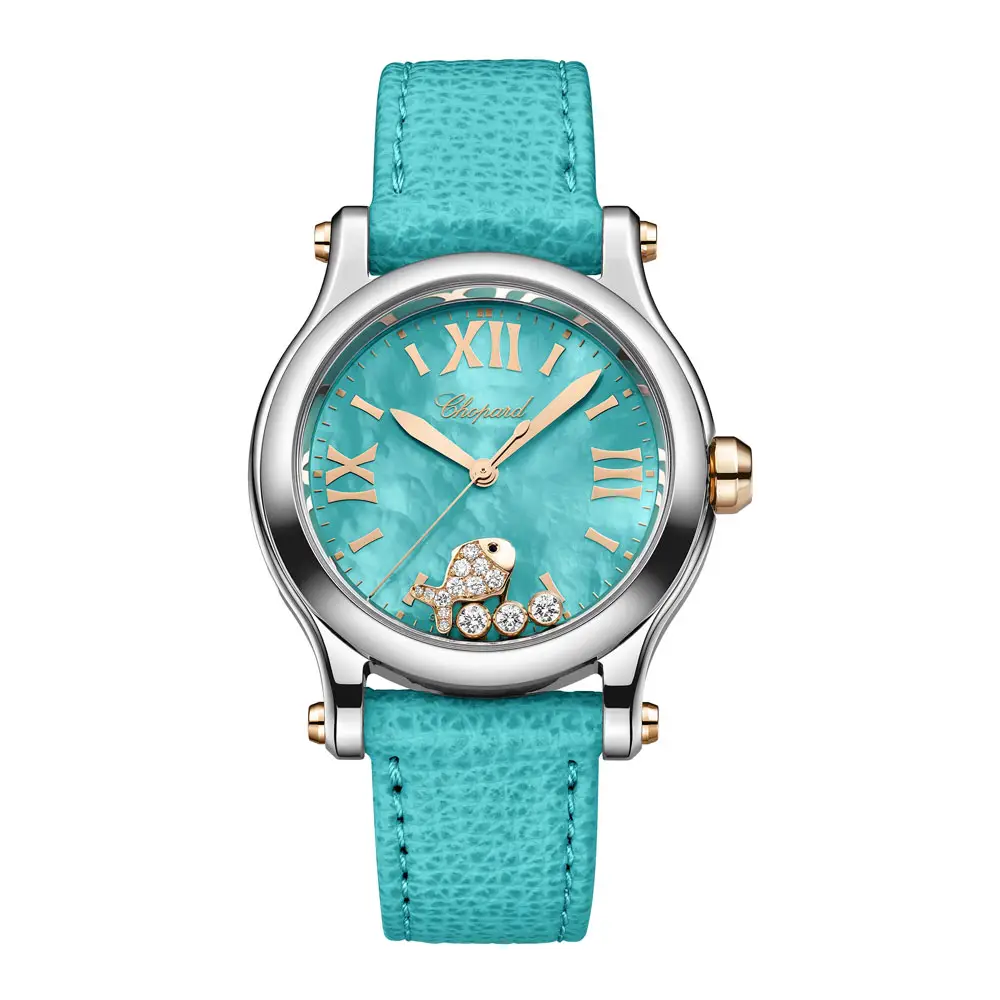 Điểm nhấn chính là mặt số ngọc trai xanh turquoise, trên đó nổi bật một con cá vàng cách điệu - biểu tượng 'Happy Fish' - cùng ba viên kim cương di chuyển tự do và hai yếu tố sapphire. Thiết kế mơ màng này bắt trọn ảo giác chuyển động và niềm vui đặc trưng của bộ sưu tập Happy Diamonds. Kim và chi tiết vàng hồng hoàn thiện sự hài hòa của tổng thể.