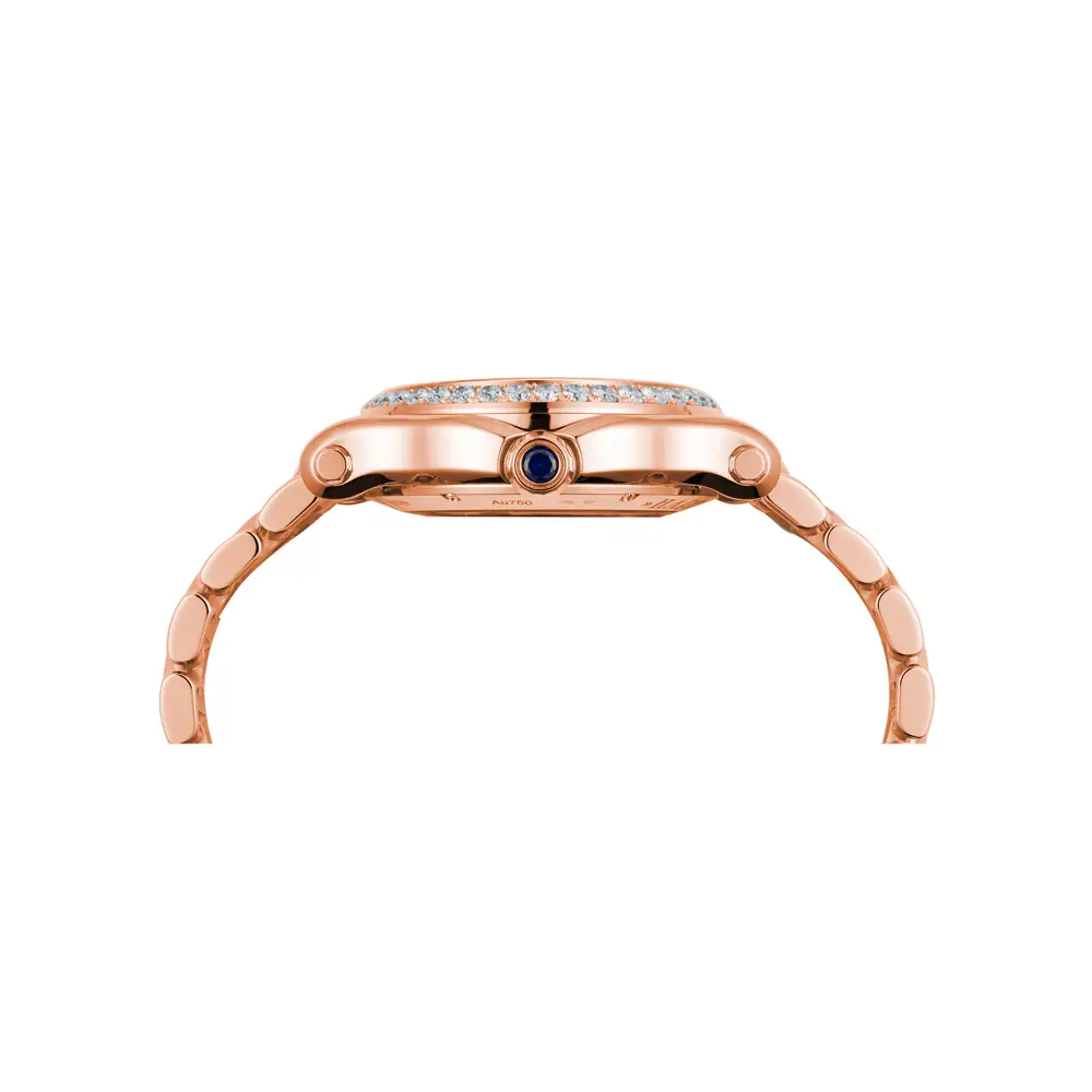 Vỏ đồng hồ tròn 36 mm, vành bezel đính kim cương, và dây đeo vàng hồng tích hợp mang đến sự hài hòa tuyệt đối. Ẩn dưới mặt kính sapphire, mặt số màu bạc với những viên kim cương chuyển động mang lại nét sinh động và quyến rũ.