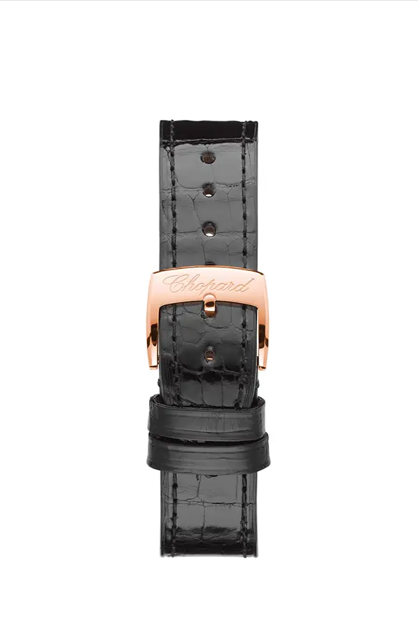 Dây đeo da cá sấu màu đen với khóa gài truyền thống hoàn thiện vẻ ngoài đầy thanh lịch và nổi bật.