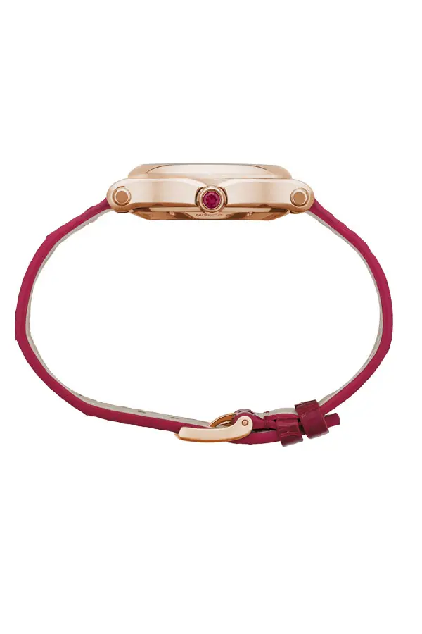Vỏ vàng hồng 18k kích thước 33 mm bảo vệ mặt số đỏ với chữ số La Mã và tám viên kim cương “dancing diamonds” di chuyển tự do giữa hai lớp kính sapphire, tỏa sáng theo từng cử động cổ tay. Kính sapphire phủ chống phản chiếu giúp bảo vệ hoàn hảo, trong khi dây da cá sấu màu đỏ cùng khóa gài cổ điển tạo nên vẻ đẹp tinh tế.