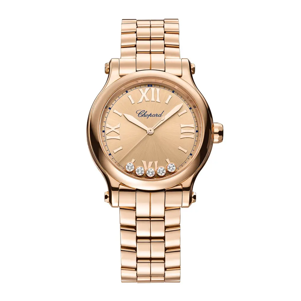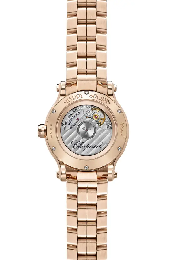Vỏ vàng hồng 18k kích thước 33 mm được tô điểm bởi năm viên kim cương “dancing diamonds” di chuyển tự do giữa hai lớp kính sapphire, tỏa sáng lấp lánh theo từng cử động cổ tay. Kính sapphire phủ chống phản chiếu giúp bảo vệ hoàn hảo và đảm bảo độ trong suốt, trong khi bộ máy tự động CHOPARD 09.01-C mang lại dự trữ năng lượng 42 giờ cùng độ chính xác tuyệt vời.