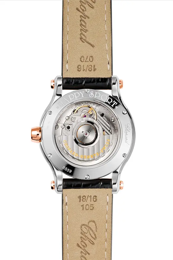 Bên trong là bộ máy cơ tự động Thụy Sĩ, chính xác và bền bỉ. Dây da cá sấu màu đen tạo sự tương phản sang trọng và thoải mái. Chopard Happy Sport 278559-6001 không chỉ là đồng hồ – mà còn là một tác phẩm kết hợp giữa nghệ thuật chế tác đồng hồ và trang sức cao cấp, biểu tượng của sức mạnh và vẻ đẹp nữ giới.