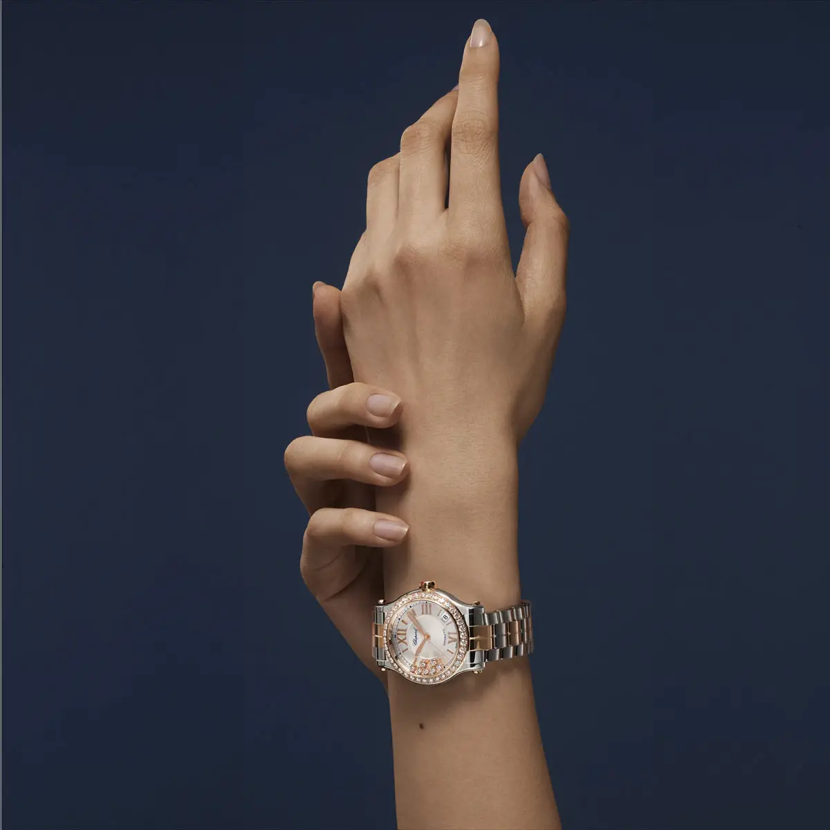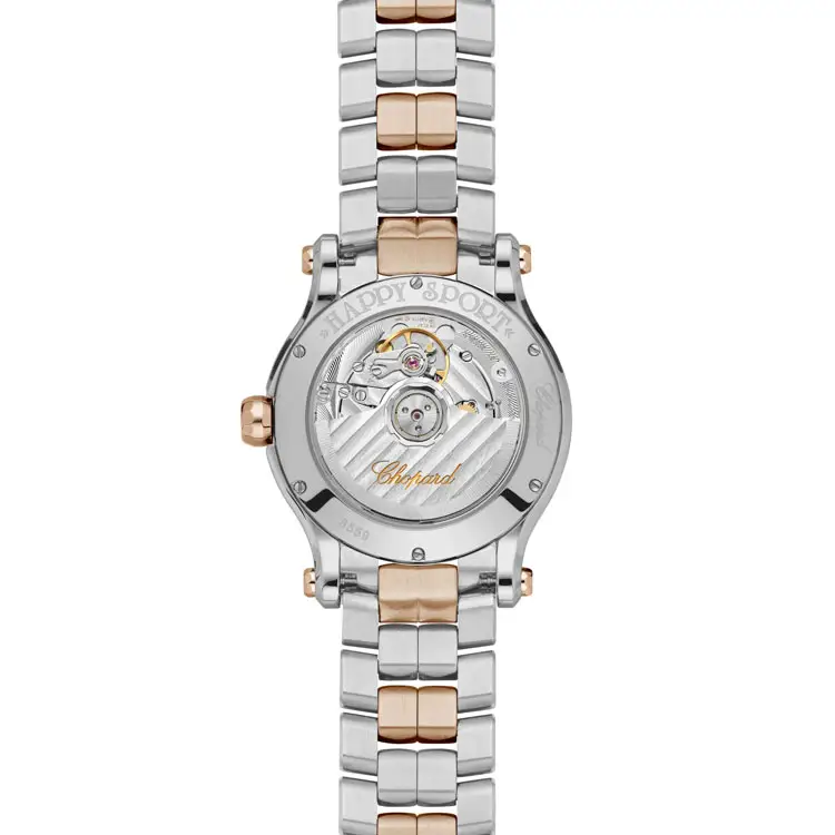 Dây đeo kết hợp giữa thép không gỉ và vàng hồng tạo nên sự cân bằng hoàn hảo giữa nét cổ điển và hiện đại. Chopard Happy Sport 278559-6025 không chỉ là một chiếc đồng hồ, mà còn là một món trang sức thể hiện phong cách, sự tự tin và niềm hạnh phúc trong từng khoảnh khắc.