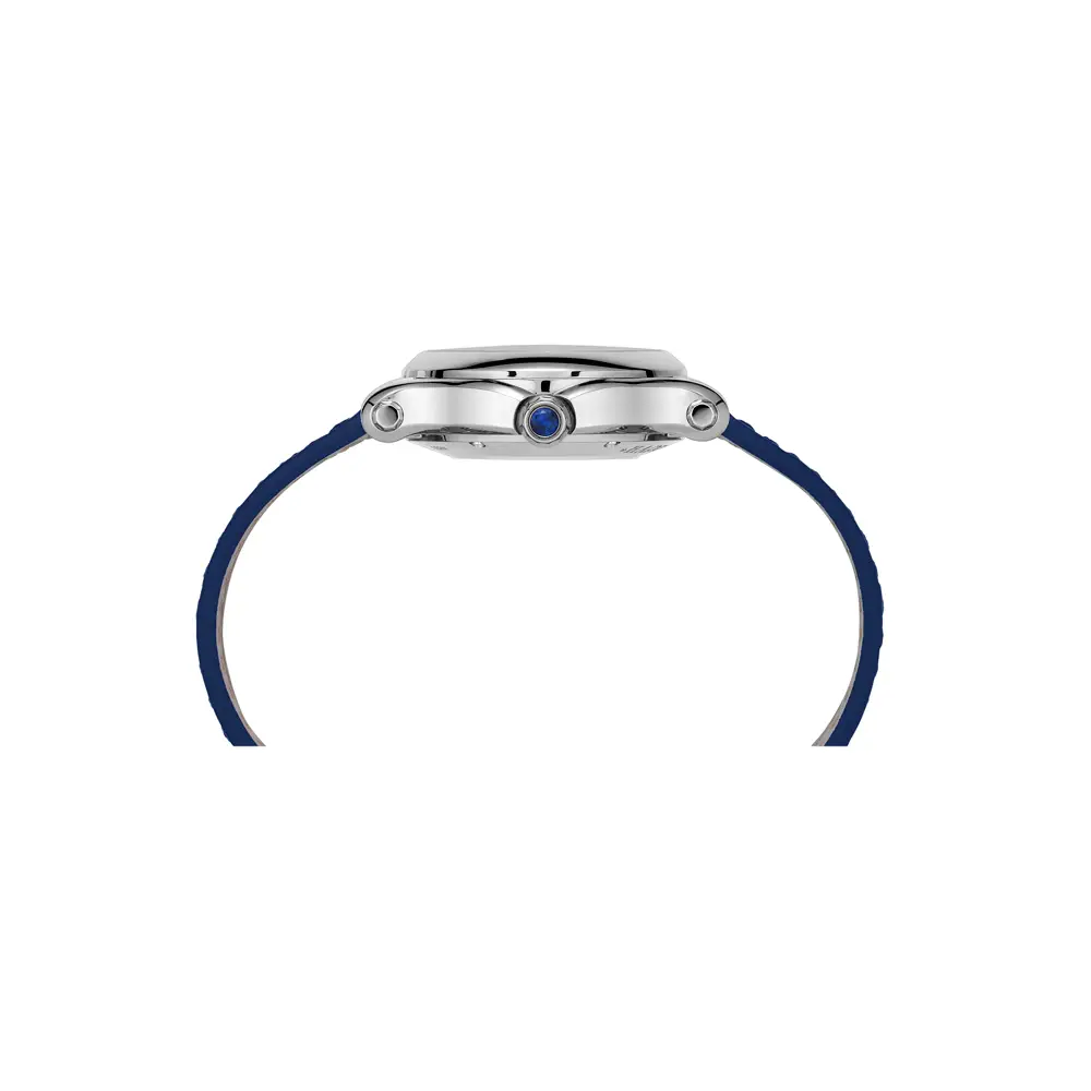 Vỏ tròn 36 mm bằng thép không gỉ kết hợp hài hòa với mặt số xanh lam và dây da cùng tông màu, tạo nên tổng thể đồng điệu. Lịch ngày được thiết kế kín đáo, giữ cho bố cục đồng hồ gọn gàng, thanh lịch. Mặt kính sapphire giúp bảo vệ chống trầy xước tối đa.