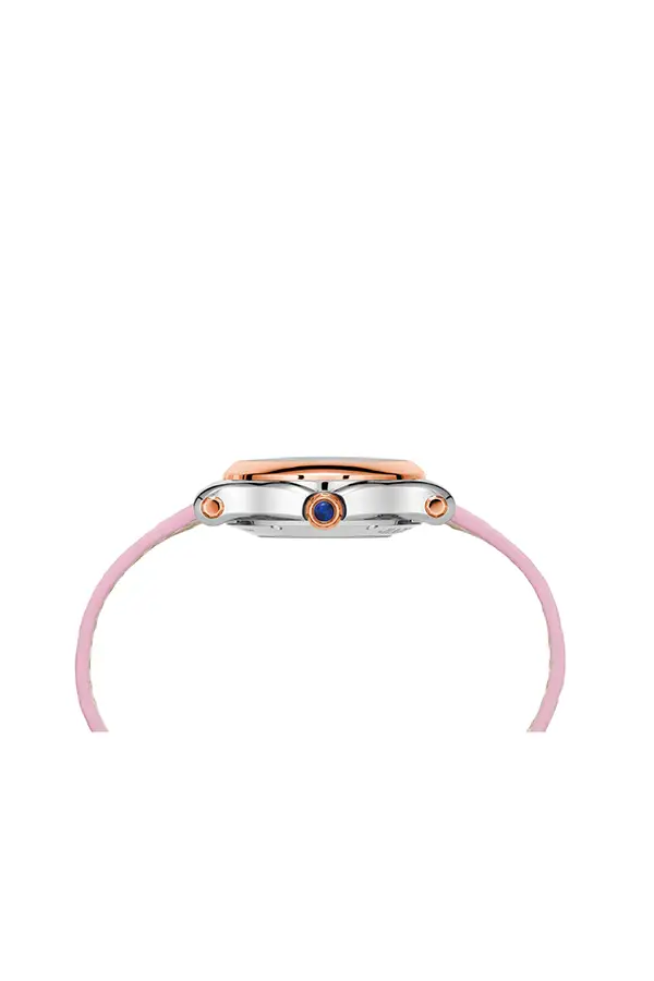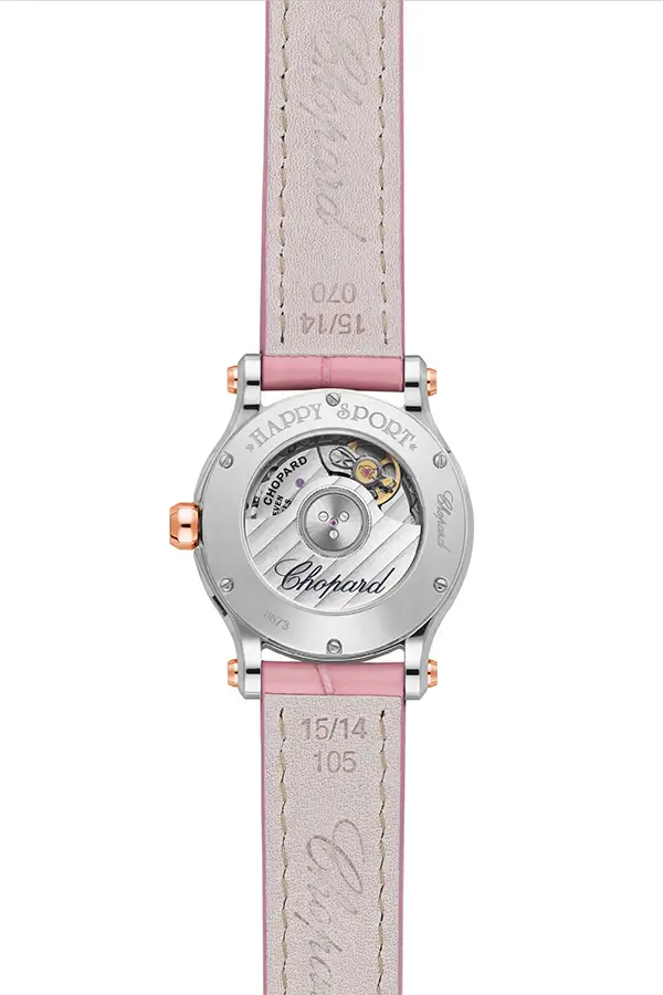 Vỏ tròn 30 mm bằng thép không gỉ được điểm xuyết bằng vành bezel vàng hồng 18K, ôm lấy mặt số màu hồng lấp lánh. Dây da cá sấu màu hồng tạo nên tổng thể hài hòa và duyên dáng. Kính sapphire bảo vệ mặt số khỏi trầy xước và tăng vẻ sáng bóng.