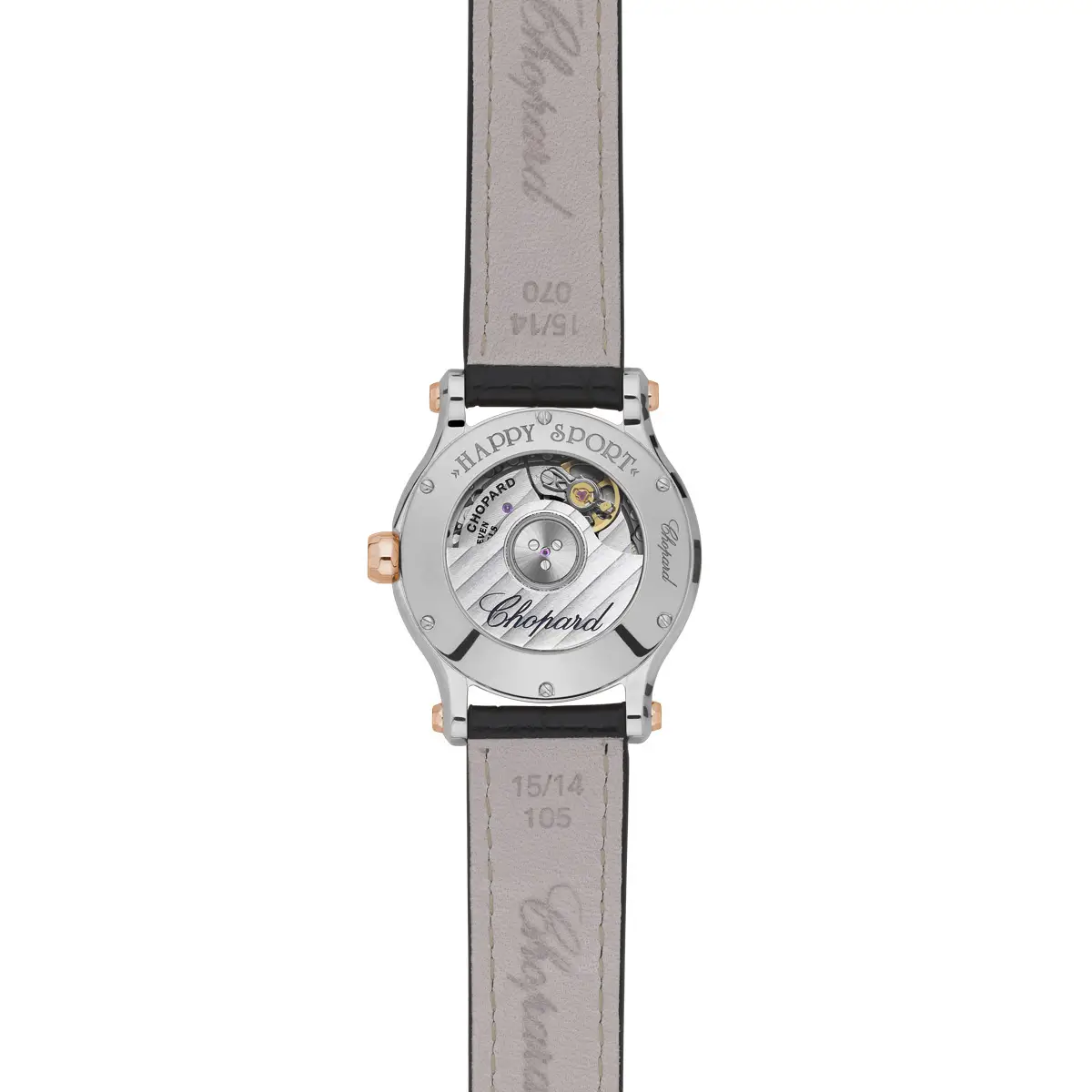 Chopard Happy Sport 278573-6015 là biểu tượng của nét đẹp mạnh mẽ và thanh lịch, dành riêng cho người phụ nữ hiện đại. Vỏ tròn 30 mm bằng thép không gỉ, nổi bật với vành bezel vàng hồng 18K đính kim cương, tạo nên điểm nhấn sang trọng và quyến rũ.