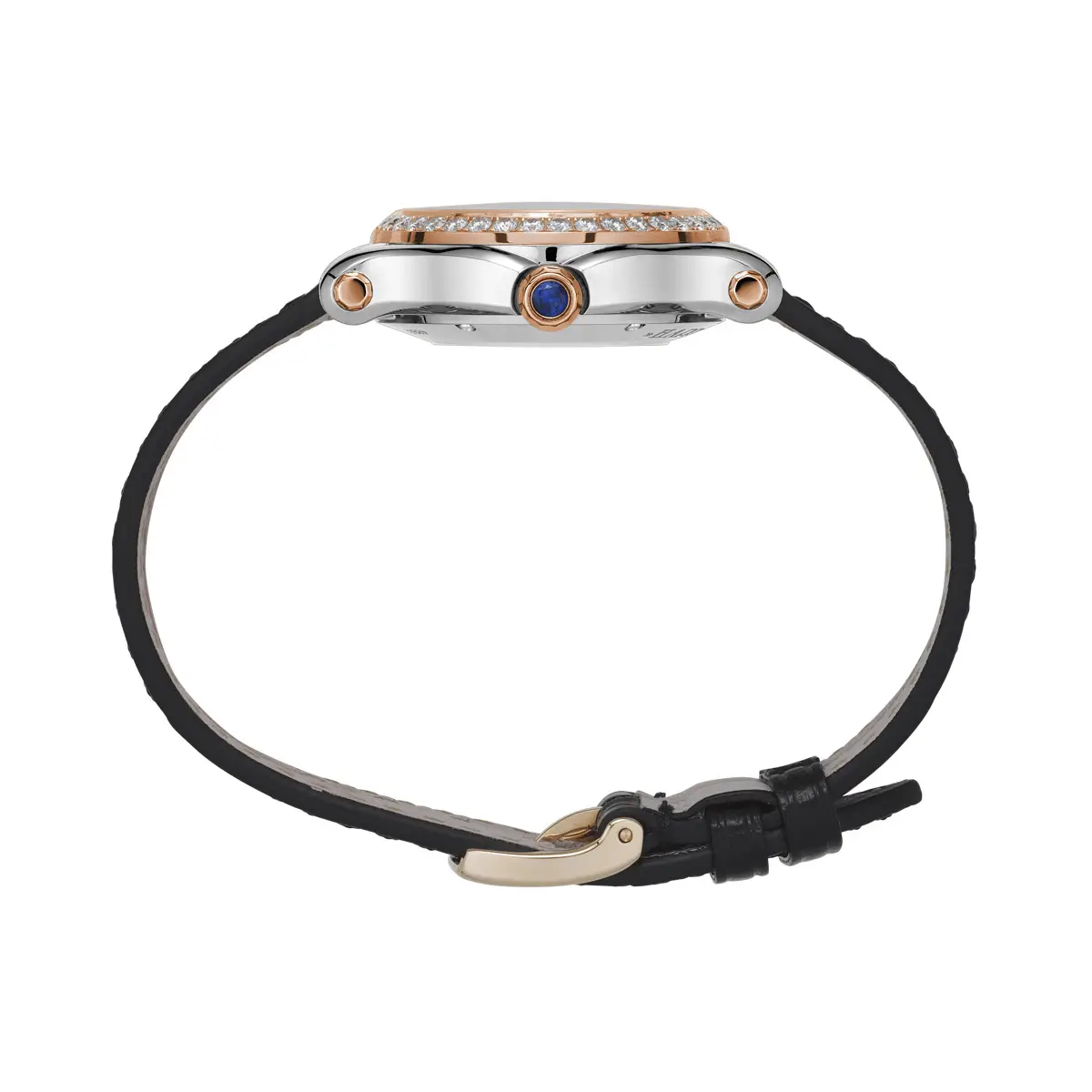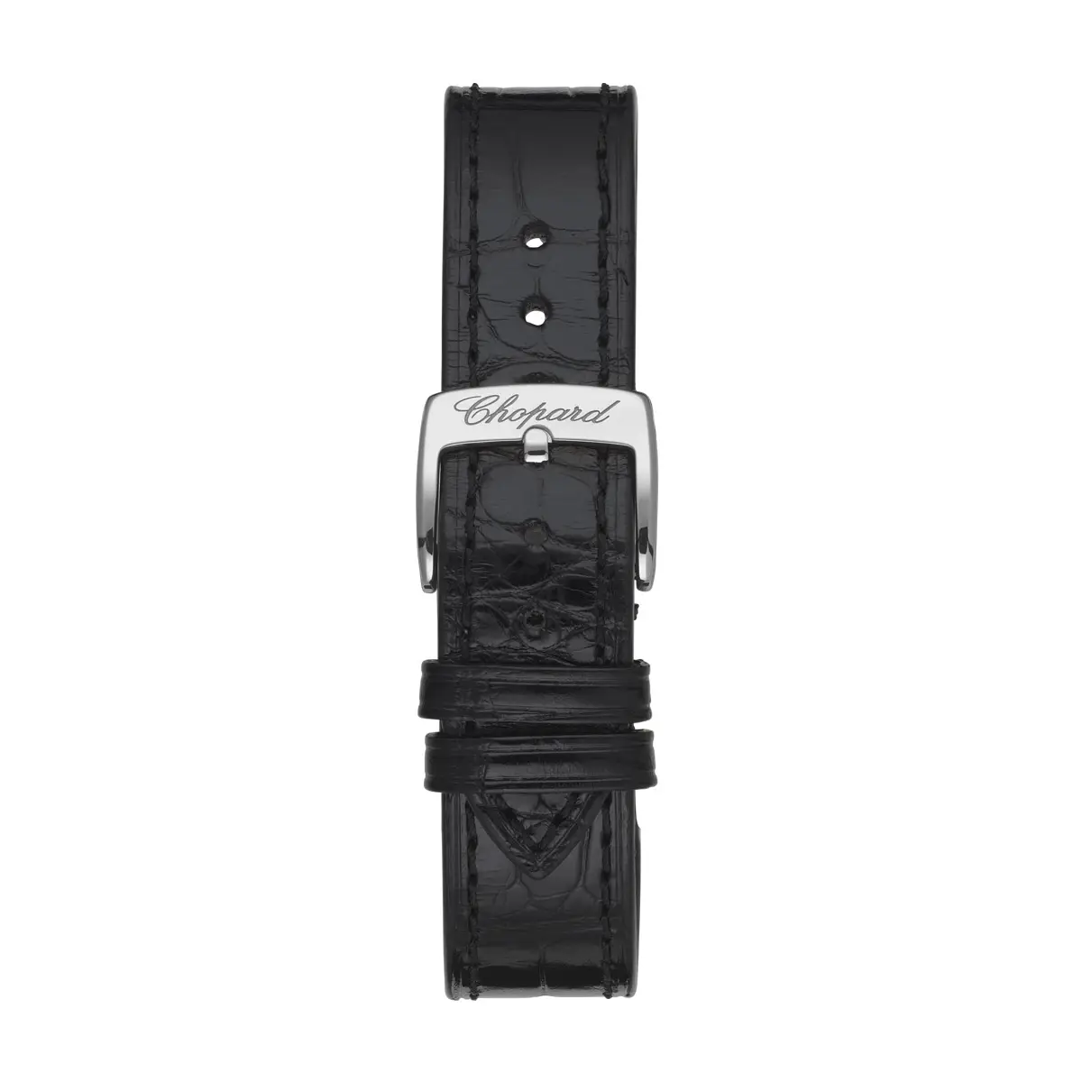 Dây đeo da cá sấu màu đen cùng khóa gài cổ điển tạo nên sự đối lập hoàn hảo với các chi tiết vàng hồng. Bên trong là bộ máy cơ tự động, hoạt động mượt mà, không cần lên dây thủ công.