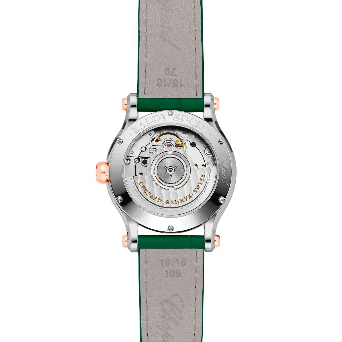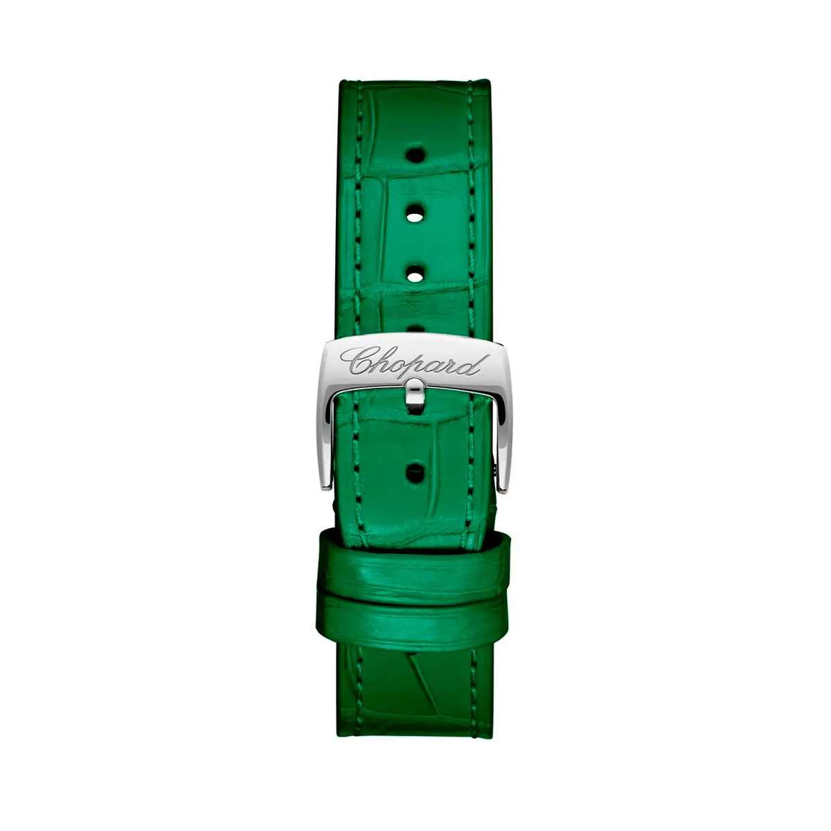 Mặt số màu xanh đính kim cương chuyển động – đặc trưng của dòng Happy Sport, tạo nên ánh sáng lung linh theo từng cử động. Dây da cá sấu xanh cùng khóa kim đảm bảo sự chắc chắn và thoải mái.