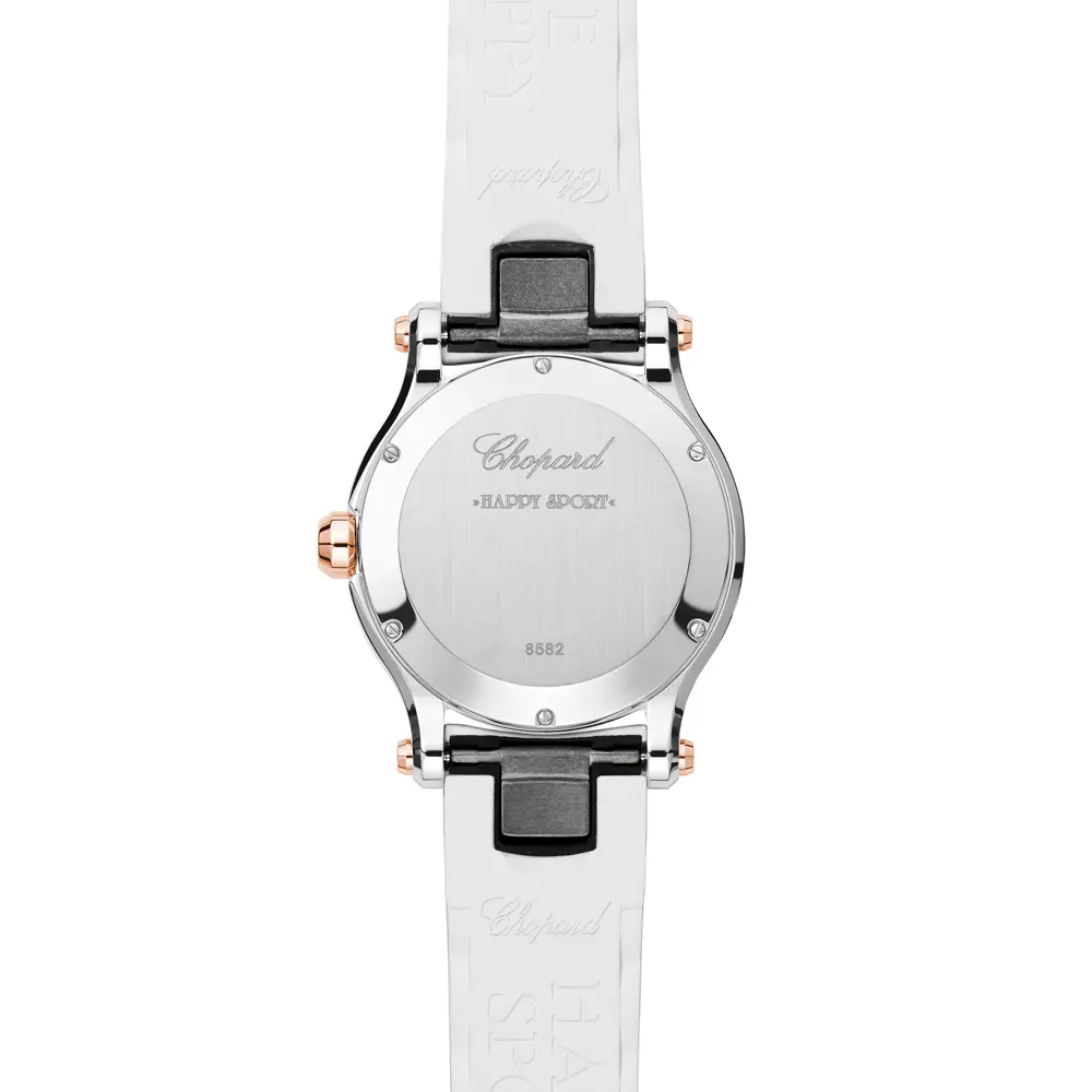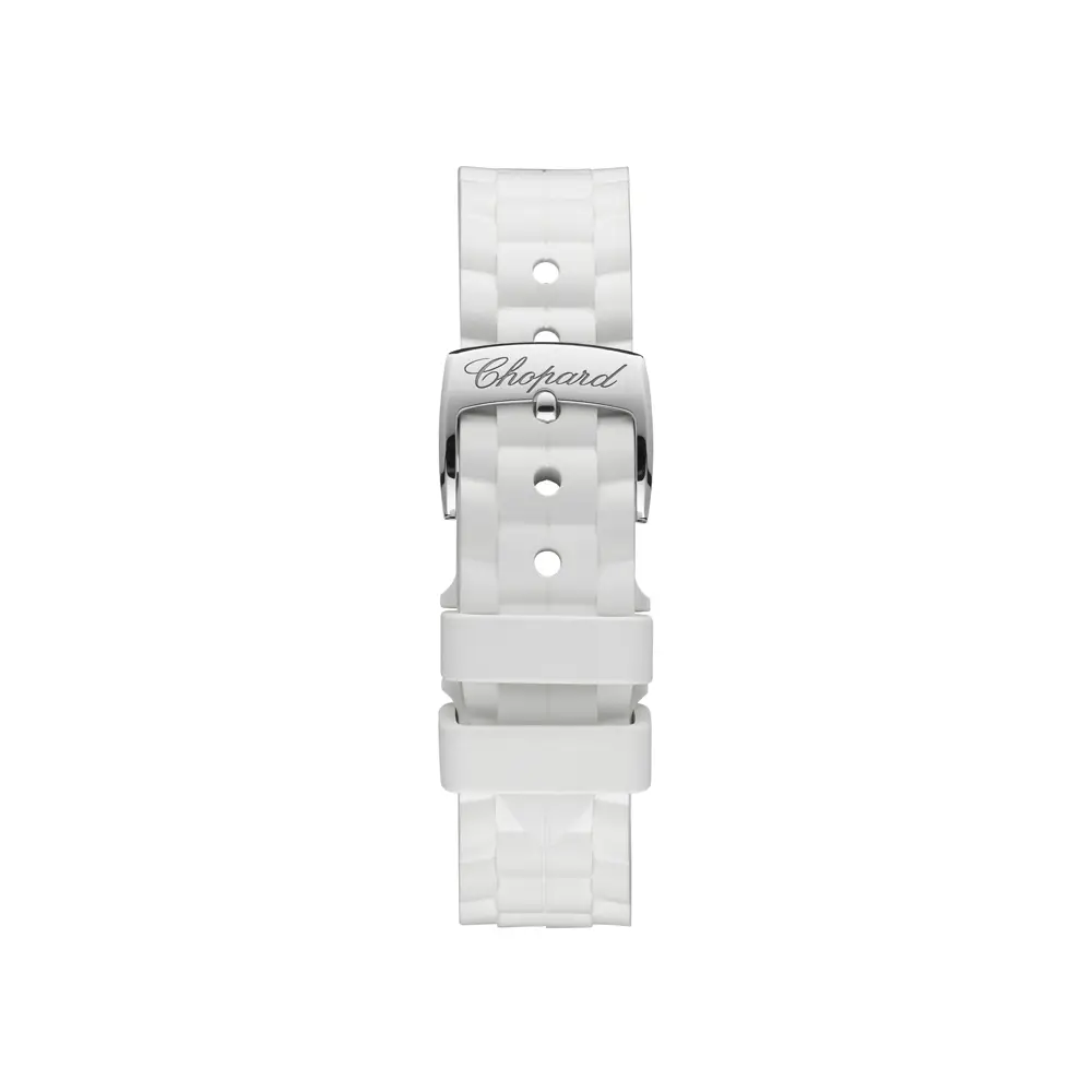 Bên trong là bộ máy quartz Thụy Sĩ, chính xác và bền bỉ không cần lên dây cót. Dây cao su màu trắng tạo điểm nhấn hiện đại, còn khóa cài truyền thống đảm bảo sự thoải mái và an toàn. Chopard Happy Sport 278582-6001 không chỉ là một chiếc đồng hồ – mà còn là một món trang sức thể hiện niềm vui, sự nữ tính và tinh thần tự do.