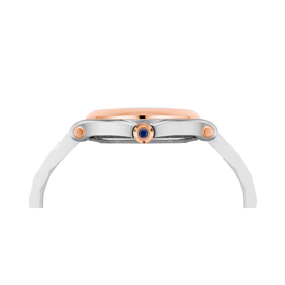 Vỏ 36 mm nổi bật với vành vàng hồng 18k tương phản trên nền thép, mang lại vẻ quý phái tinh tế. Kính sapphire chống trầy bảo vệ mặt số trắng thanh lịch, nơi ba viên kim cương tự do chuyển động giữa hai lớp kính, tạo nên ánh sáng sống động. Khả năng chống nước 30 m phù hợp cho sử dụng hàng ngày.