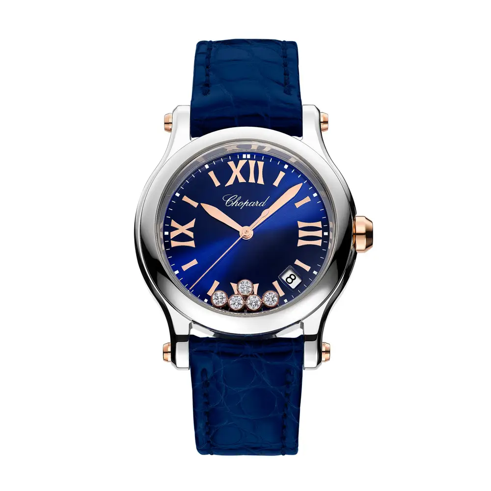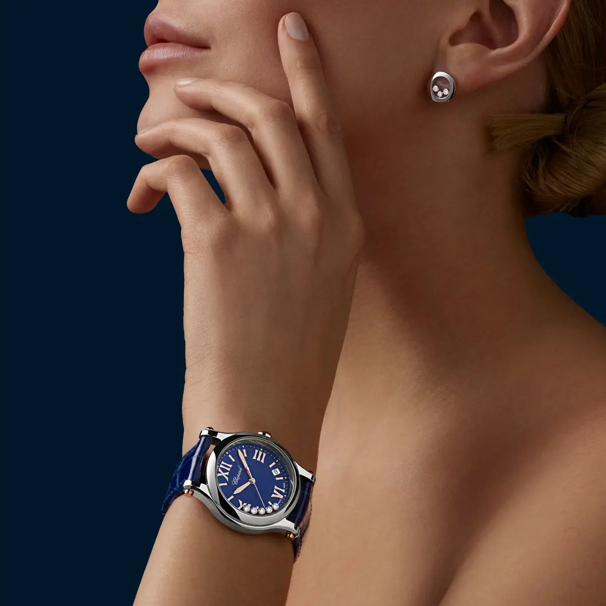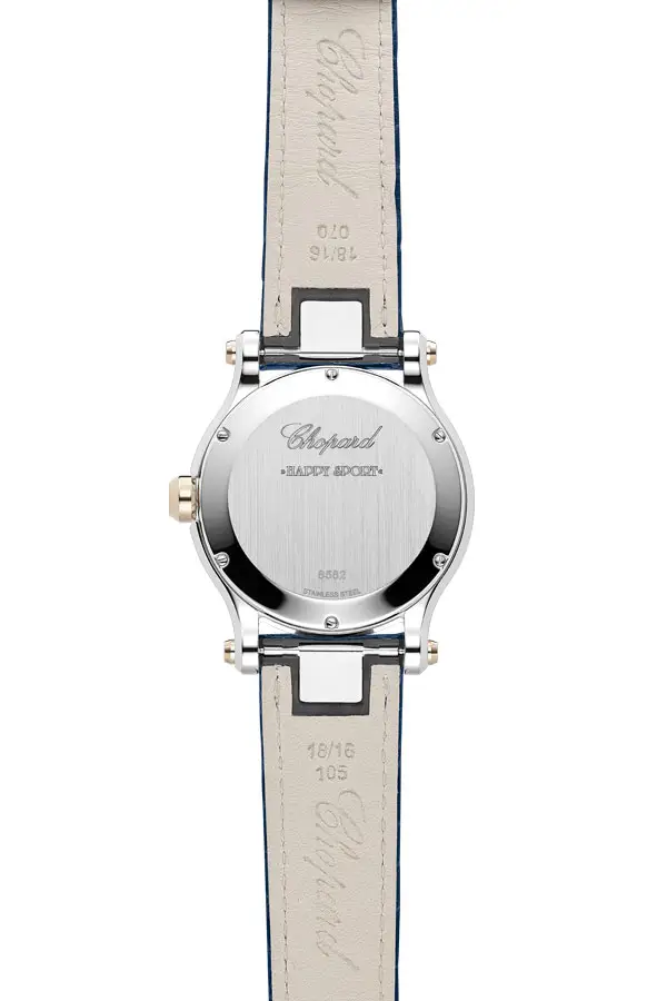 Vỏ thép không gỉ 36 mm được trang trí với vành bezel có rãnh tinh tế, được bảo vệ bởi kính sapphire phủ chống phản chiếu. Mặt số màu xanh có lịch ngày ở vị trí 4 giờ, nổi bật với năm viên kim cương “dancing diamonds” di chuyển tự do giữa hai lớp kính sapphire – biểu tượng của niềm vui và sự chuyển động trong Happy Sport. Đồng hồ có khả năng chống nước 30 mét, phù hợp cho mọi ngày.