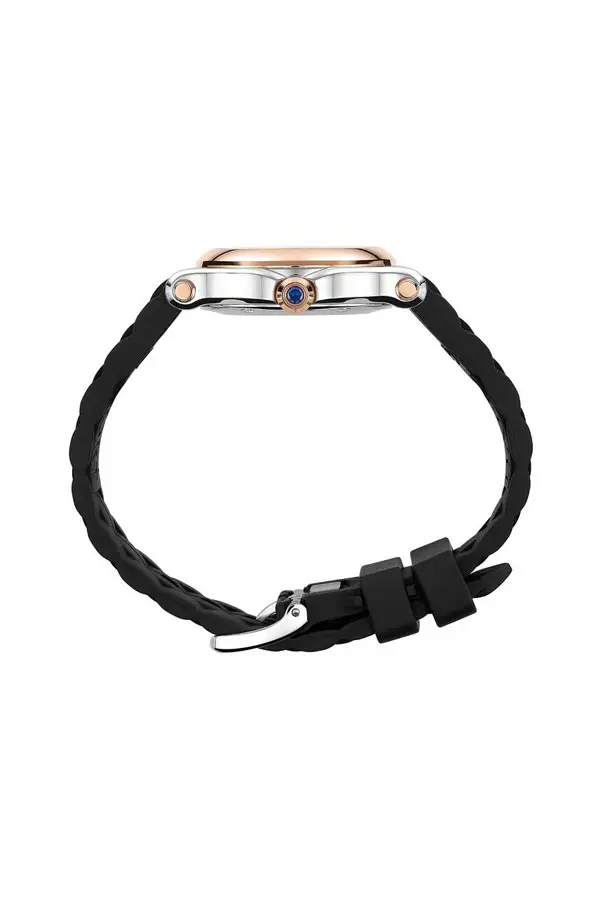 Vỏ tròn 30 mm bằng thép không gỉ, nổi bật với vành bezel bằng vàng hồng 18K, mang lại sự tinh tế và quyến rũ. Mặt kính sapphire bảo vệ mặt số màu bạc, nơi những viên kim cương chuyển động tự do tạo nên ánh sáng lung linh theo từng chuyển động cổ tay.