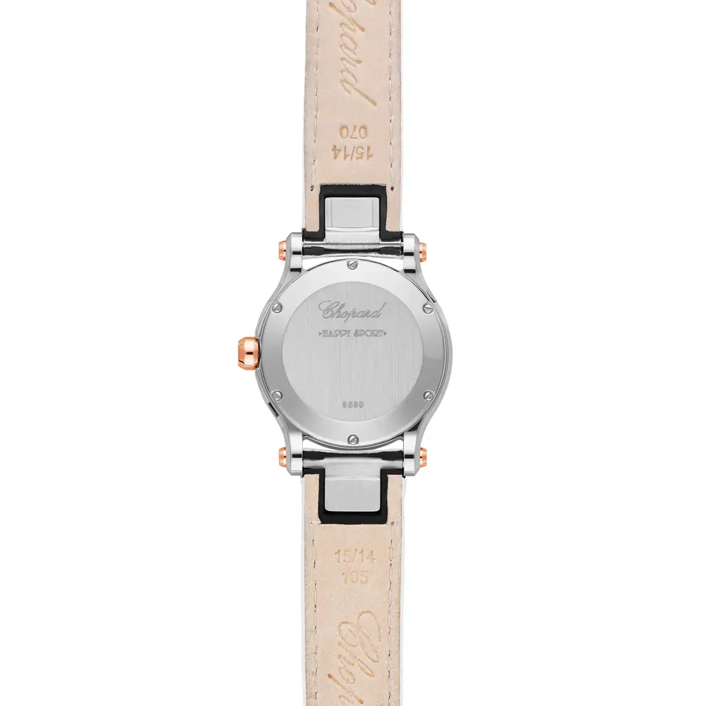 Chopard Happy Sport 278590-6005 là sự kết hợp hoàn hảo giữa vẻ đẹp nữ tính, tinh tế trong từng chi tiết và sự sang trọng hiện đại. Vỏ tròn 30 mm chế tác từ thép không gỉ kết hợp vàng hồng 18K mang lại sự hài hòa giữa ánh kim lạnh và sắc vàng ấm áp.