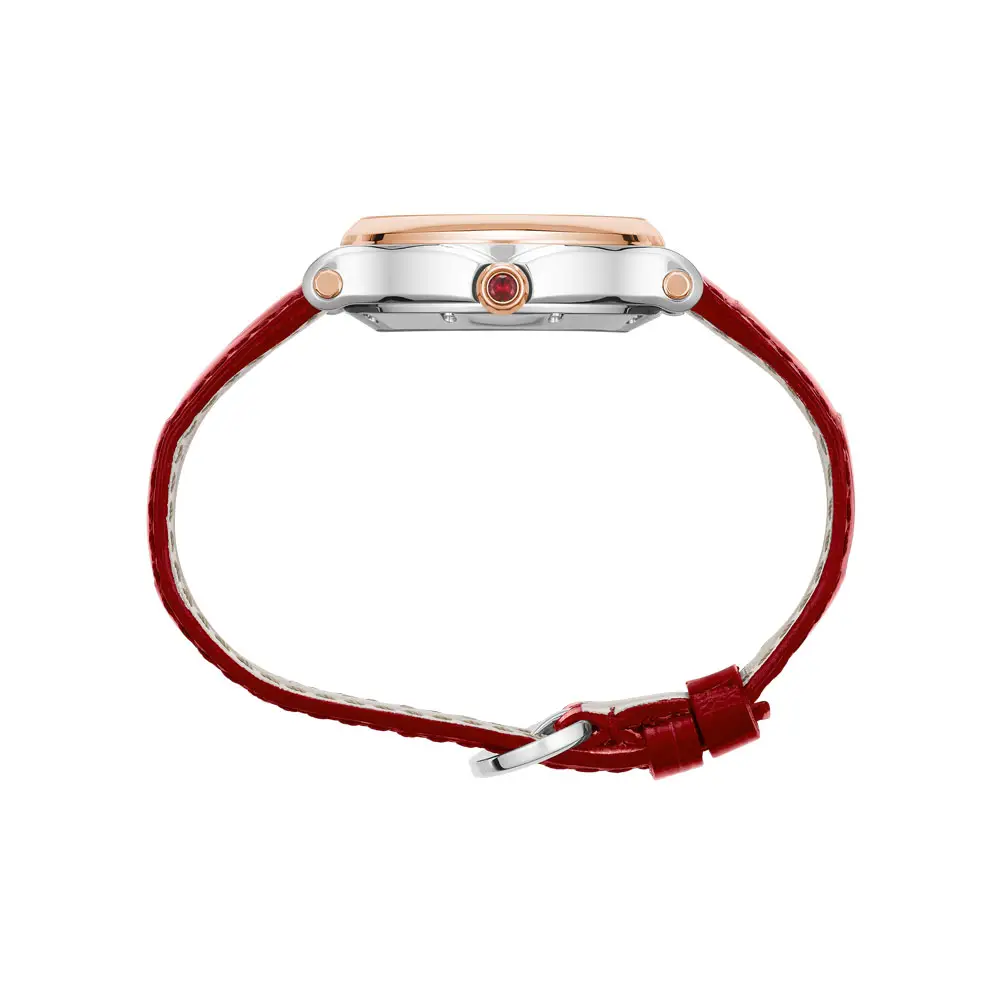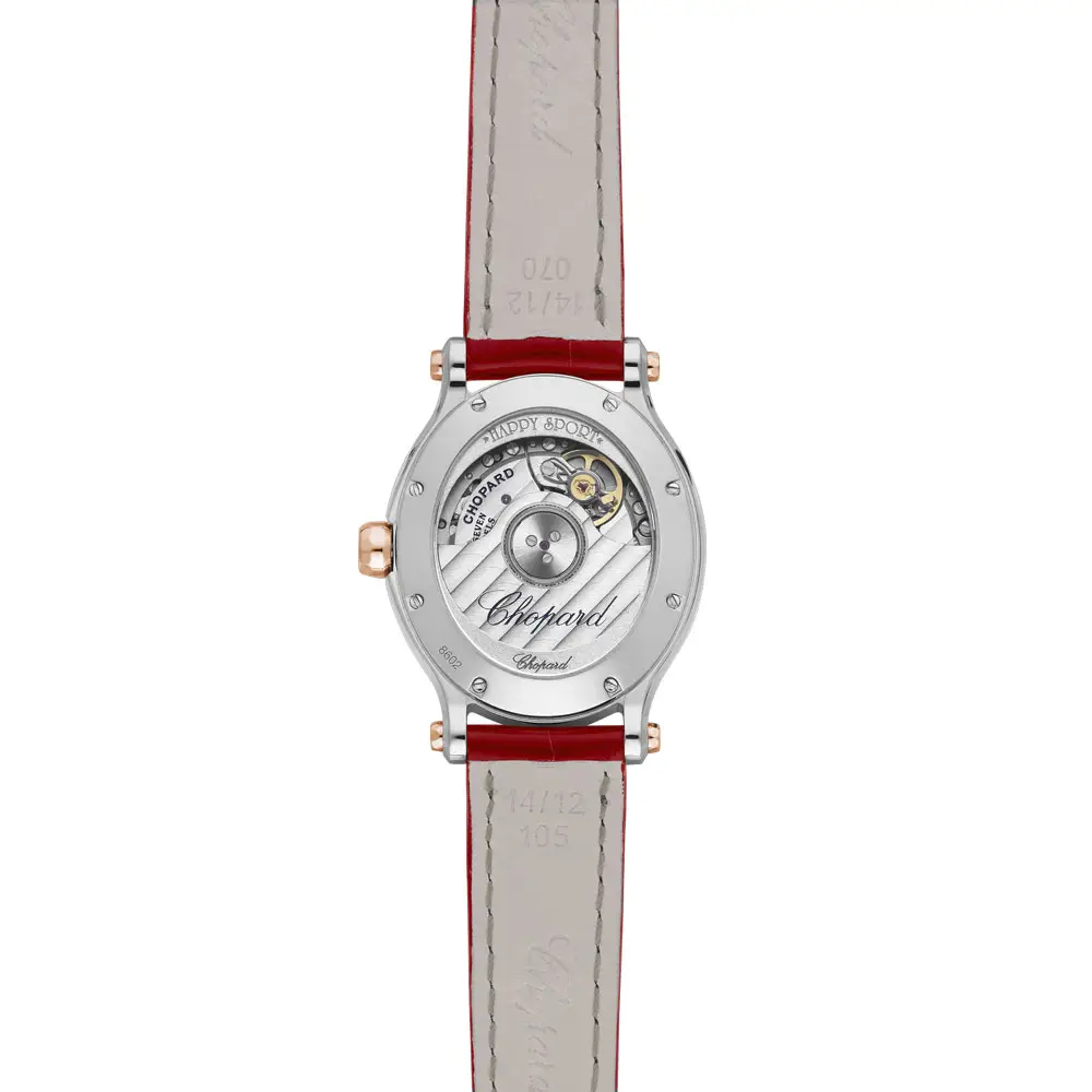 Chopard Happy Sport 278602-6006 thể hiện vẻ đẹp nữ tính tinh tế trong tông màu burgundy sang trọng. Vỏ đồng hồ hình oval tròn trịa với kích thước 29 x 31 mm, được chế tác từ thép không gỉ và vàng hồng 18K, mang đến vẻ mềm mại nhưng không kém phần sang trọng. Điểm nhấn nổi bật là mặt số màu burgundy đậm, nơi bảy viên kim cương lấp lánh tự do - chi tiết tinh nghịch này là biểu tượng đặc trưng của bộ sưu tập Happy Sport.
