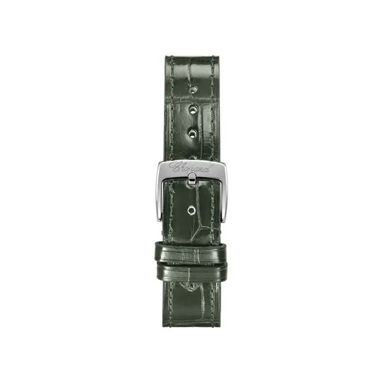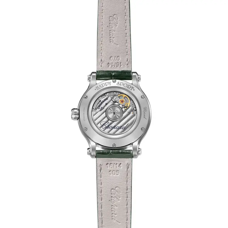 Bên trong là bộ máy cơ tự động CHOPARD 09.01-C với dự trữ năng lượng 42 giờ, đảm bảo độ chính xác và vận hành ổn định. Dây da cá sấu màu xanh tạo nên điểm nhấn thanh lịch và độc đáo. Chopard Happy Sport 278608-3010 không chỉ là một chiếc đồng hồ – mà còn là một món trang sức thể hiện sự tự tin và phong thái nữ tính hiện đại.