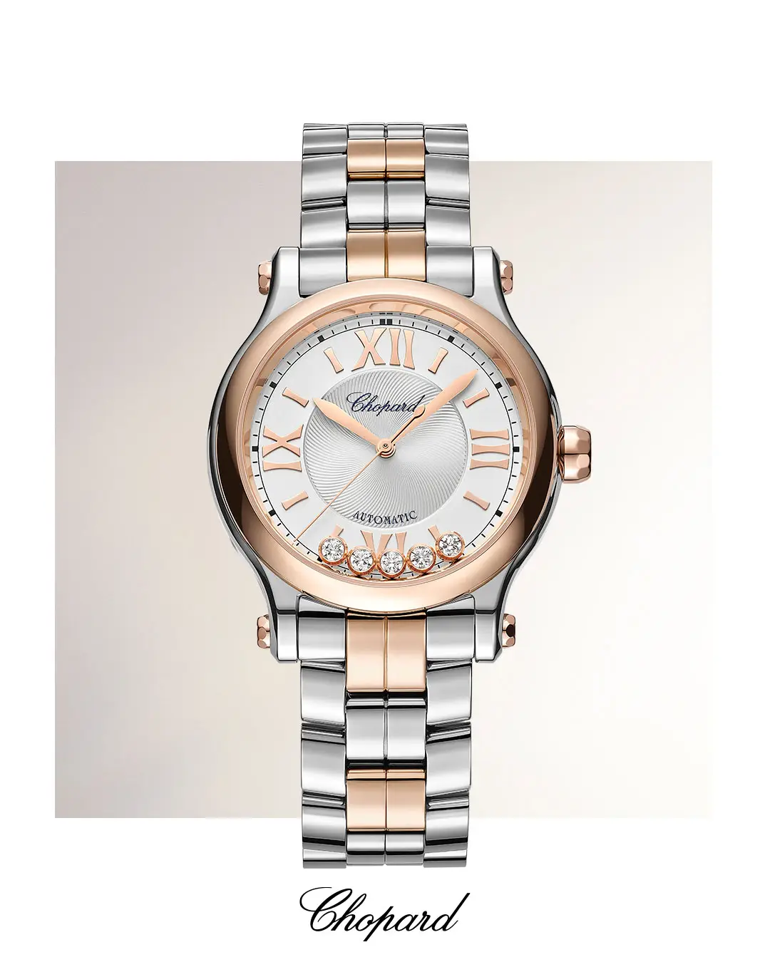Vành vàng hồng ôm lấy mặt số bạc lấp lánh với các viên kim cương di chuyển tự do, phản chiếu ánh sáng mỗi khi cổ tay chuyển động. Kính sapphire chống trầy, dây đeo hai tông màu cùng khóa gập tạo sự an tâm và thoải mái khi đeo.