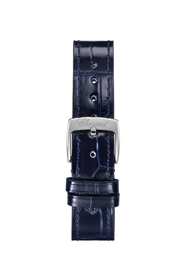 Bên trong là bộ máy cơ tự động Chopard 09.01-C, có dự trữ năng lượng 42 giờ và tần số 25.200 dao động/giờ (3 Hz), cùng 27 chân kính mang lại độ chính xác và vận hành ổn định. Dây da cá sấu màu xanh tạo điểm nhấn thanh lịch, trong khi khả năng chống nước 30 mét mang lại sự tiện dụng hàng ngày. Chopard Happy Sport 278608-6003 là biểu tượng của vẻ đẹp hiện đại, nơi sự tinh xảo kỹ thuật, đẳng cấp và nét dịu dàng giao hòa hoàn hảo.