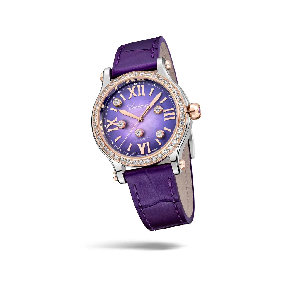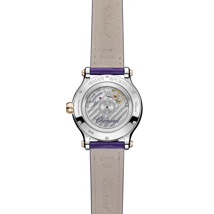 Bên trong là bộ máy tự động CHOPARD 09.01-C với dự trữ năng lượng 42 giờ, kết hợp dây da cá sấu màu tím cùng khóa gài cổ điển. Với khả năng chống nước 30 mét, Happy Sport 278608-6012 thể hiện sự xa xỉ, tự do và niềm vui sống vĩnh cửu.