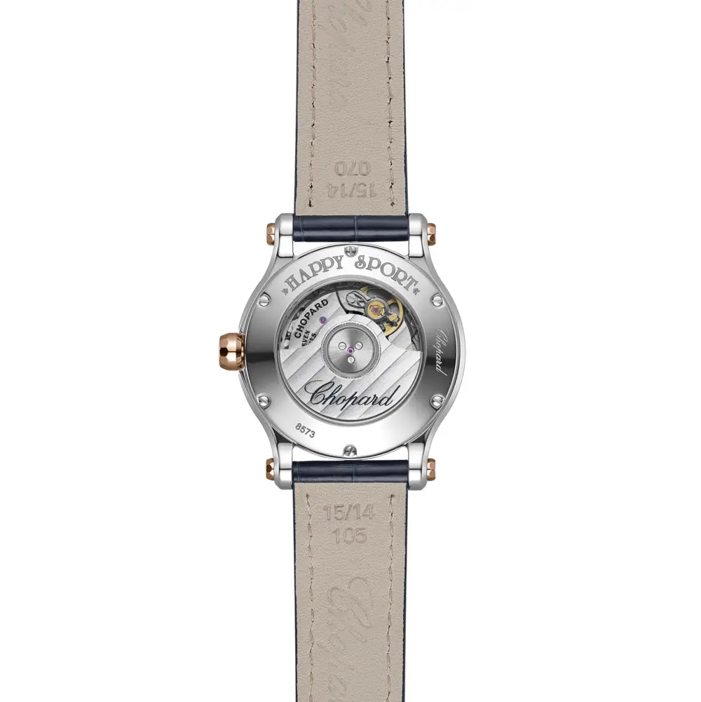Dây da cá sấu màu xanh cùng khóa gài cổ điển hoàn thiện vẻ đẹp tinh tế. Bên trong là bộ máy cơ tự động Thụy Sĩ, đảm bảo chuyển động mượt mà và chính xác. Chopard Happy Sport Sun, Moon and Stars 278573-6027 không chỉ là đồng hồ, mà còn là một tác phẩm trang sức mang cảm hứng vũ trụ, tôn vinh sự tự tin, vẻ đẹp và ánh sáng vĩnh cửu của người phụ nữ.