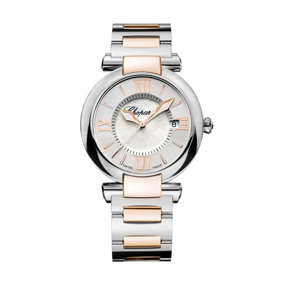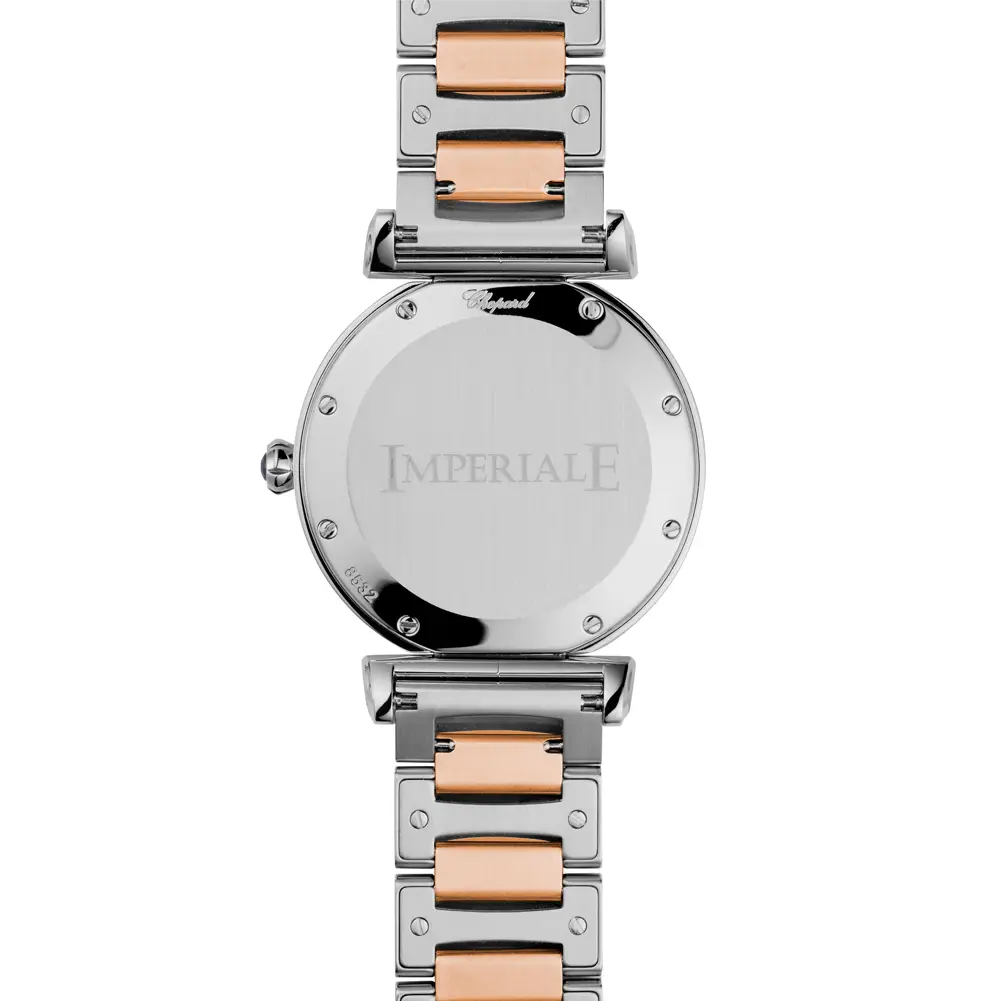 Chopard Imperiale 388532-6002 là sự kết hợp hoàn hảo giữa nét cổ điển, nữ tính và độ chính xác Thụy Sĩ. Mẫu đồng hồ này thuộc bộ sưu tập Imperiale, kết hợp giữa thép không gỉ và vàng hồng 18K, mang lại cảm giác ấm áp và sang trọng tinh tế.