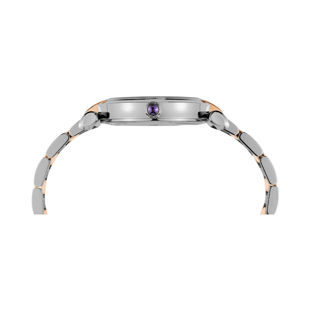 Vỏ đồng hồ 36 mm được làm từ thép đánh bóng, kết hợp cùng kính sapphire chống trầy xước bảo vệ mặt số xà cừ ánh bạc với chữ số La Mã và các vạch chỉ giờ thanh mảnh. Núm vặn đính đá thạch anh tím cabochon – chi tiết đặc trưng của dòng Imperiale – thể hiện nét cao quý và nữ tính.