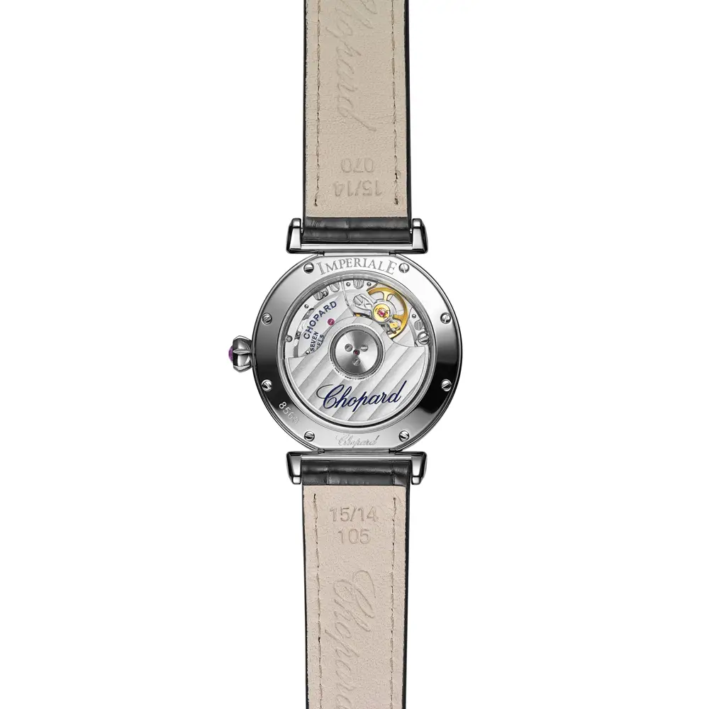 Bên trong là bộ máy tự động Chopard 09.01-C với dự trữ năng lượng khoảng 42 giờ, đảm bảo độ chính xác tuyệt đối. Dây da cá sấu màu đen mang đến nét sang trọng tinh tế và cảm giác thoải mái khi đeo. Chopard Imperiale 388563-3005 không chỉ là chiếc đồng hồ – mà còn là một món trang sức thể hiện vẻ đẹp, sức mạnh và phong thái tự tin của người phụ nữ hiện đại.