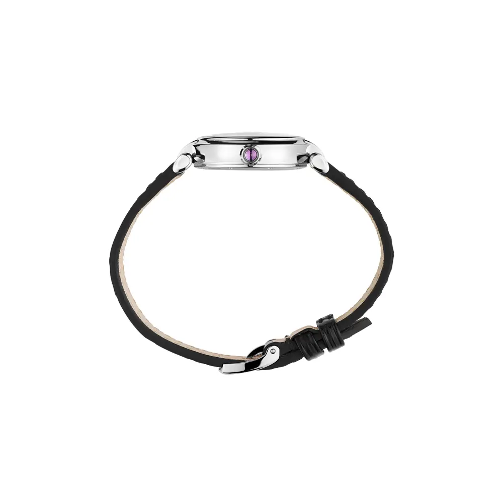 Vỏ 29 mm được chế tác từ thép không gỉ, bảo vệ bằng kính sapphire chống trầy xước, mang lại độ bền và vẻ sáng bóng lâu dài. Mặt số xà cừ ánh bạc nổi bật với chữ số La Mã và cửa sổ hiển thị ngày, trong khi núm vặn gắn đá thạch anh tím cabochon – chi tiết đặc trưng của dòng Imperiale – tỏa sáng rực rỡ.