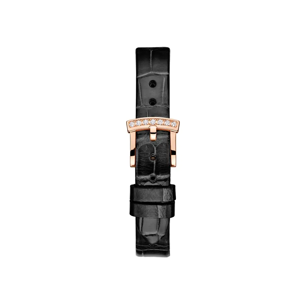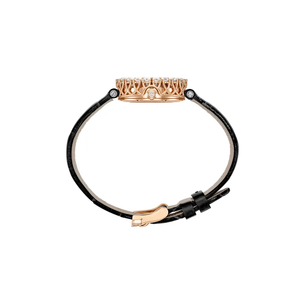 Điểm nổi bật của phiên bản này là dây da màu đen, tạo nên sự tương phản tinh tế với sắc hồng của vàng và ánh sáng kim cương. Sự kết hợp này mang lại vẻ đẹp hiện đại và quý phái. L’Heure du Diamant Round 13A178-5317 là một kiệt tác trang sức tượng trưng cho sức mạnh, vẻ đẹp và sự tinh tế của phái nữ.