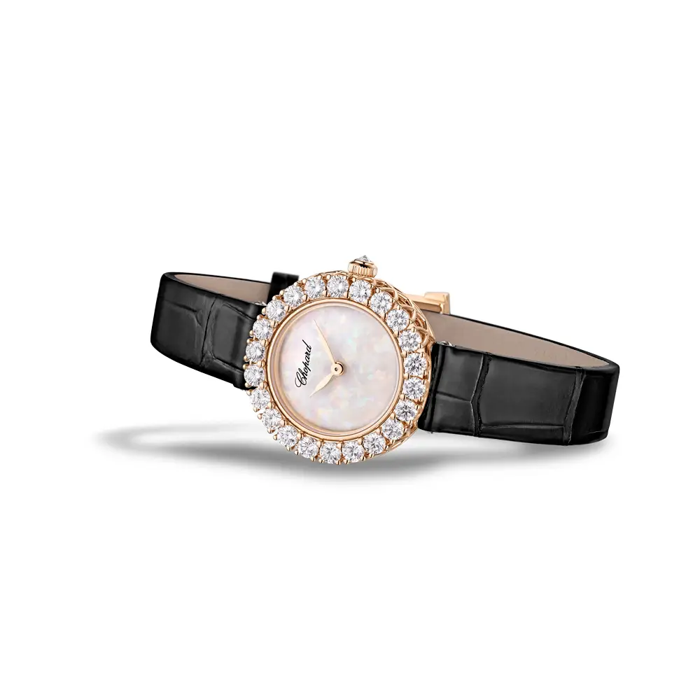 Chopard L’Heure du Diamant Round 13A178-5317 là sự kết hợp hoàn hảo giữa nghệ thuật chế tác trang sức cao cấp và kỹ nghệ đồng hồ Thụy Sĩ. Vỏ đồng hồ 26 mm bằng vàng hồng 18 kara có nguồn gốc đạo đức được viền bằng vành bezel nạm kim cương tổng cộng 2,35 carat, tỏa sáng rực rỡ và đầy tinh tế. Mỗi chi tiết thể hiện tay nghề bậc thầy của Chopard trong việc hòa quyện giữa sự sang trọng và nghệ thuật.