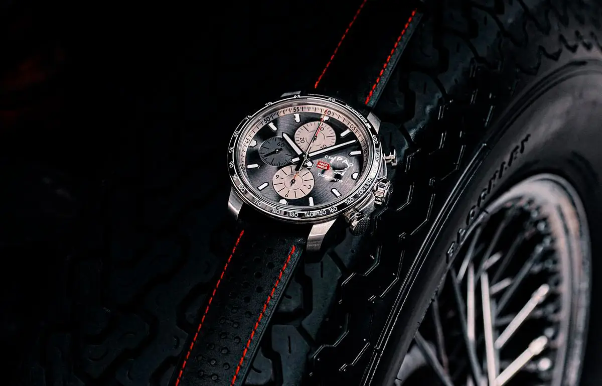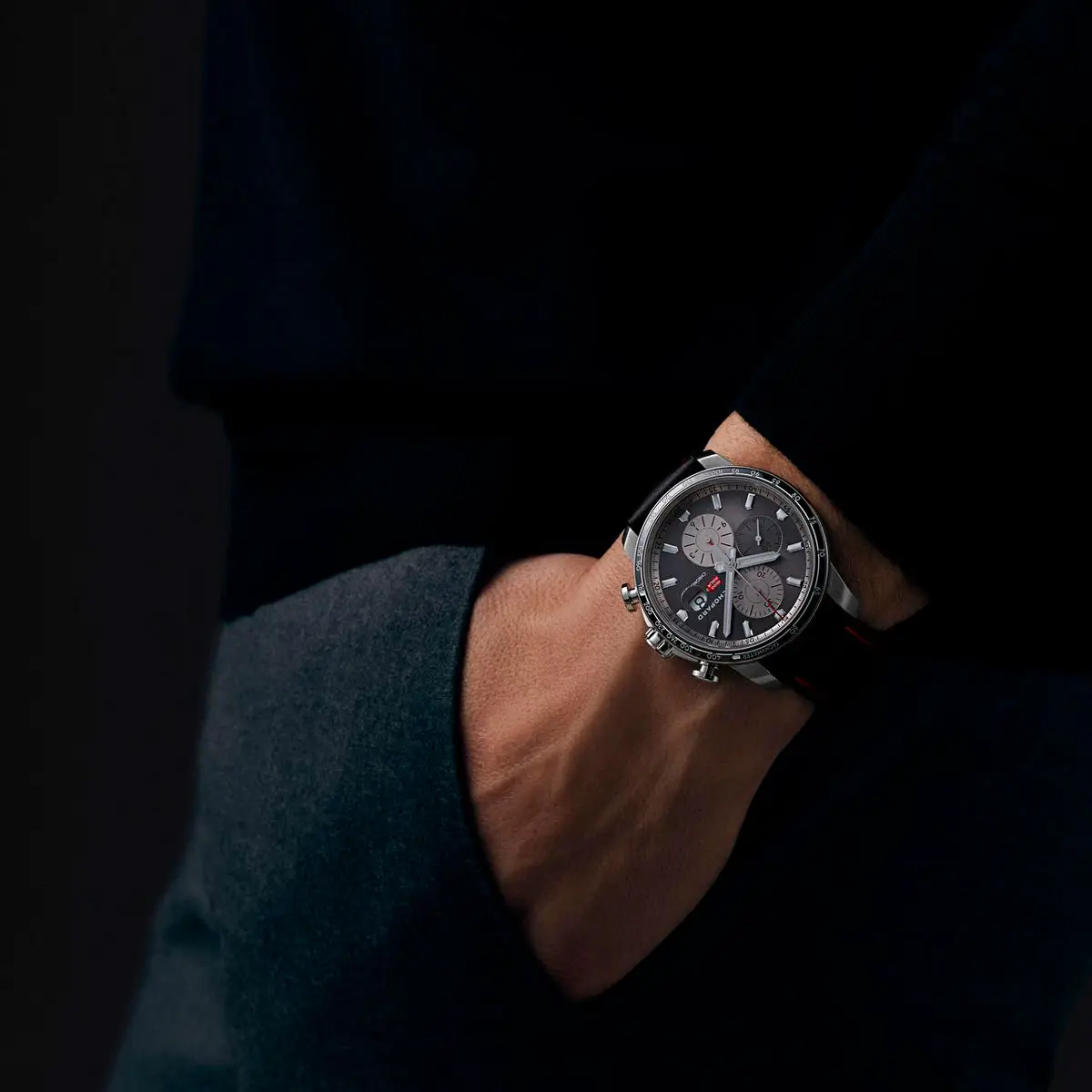 Vỏ 44 mm bằng thép không gỉ kết hợp viền thép và nhôm, mang lại dáng vẻ mạnh mẽ và hiện đại. Mặt số xám với chi tiết đỏ lấy cảm hứng từ phong cách đua xe, được bảo vệ bởi kính sapphire chống phản chiếu. Đồng hồ trang bị chức năng chronograph, lịch ngày và kim phủ dạ quang giúp dễ đọc trong mọi điều kiện ánh sáng.