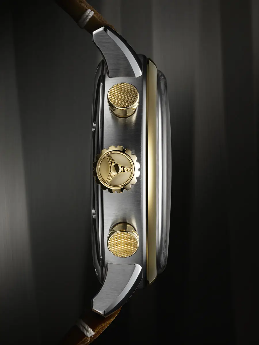 Vỏ tròn 40,5 mm được chế tác từ thép không gỉ, đi kèm vành bezel bằng vàng vàng 18K tạo nên điểm nhấn sang trọng. Mặt kính sapphire chống xước, cùng với khả năng chống nước 5ATM / 50M đảm bảo độ bền và linh hoạt trong sử dụng hàng ngày.