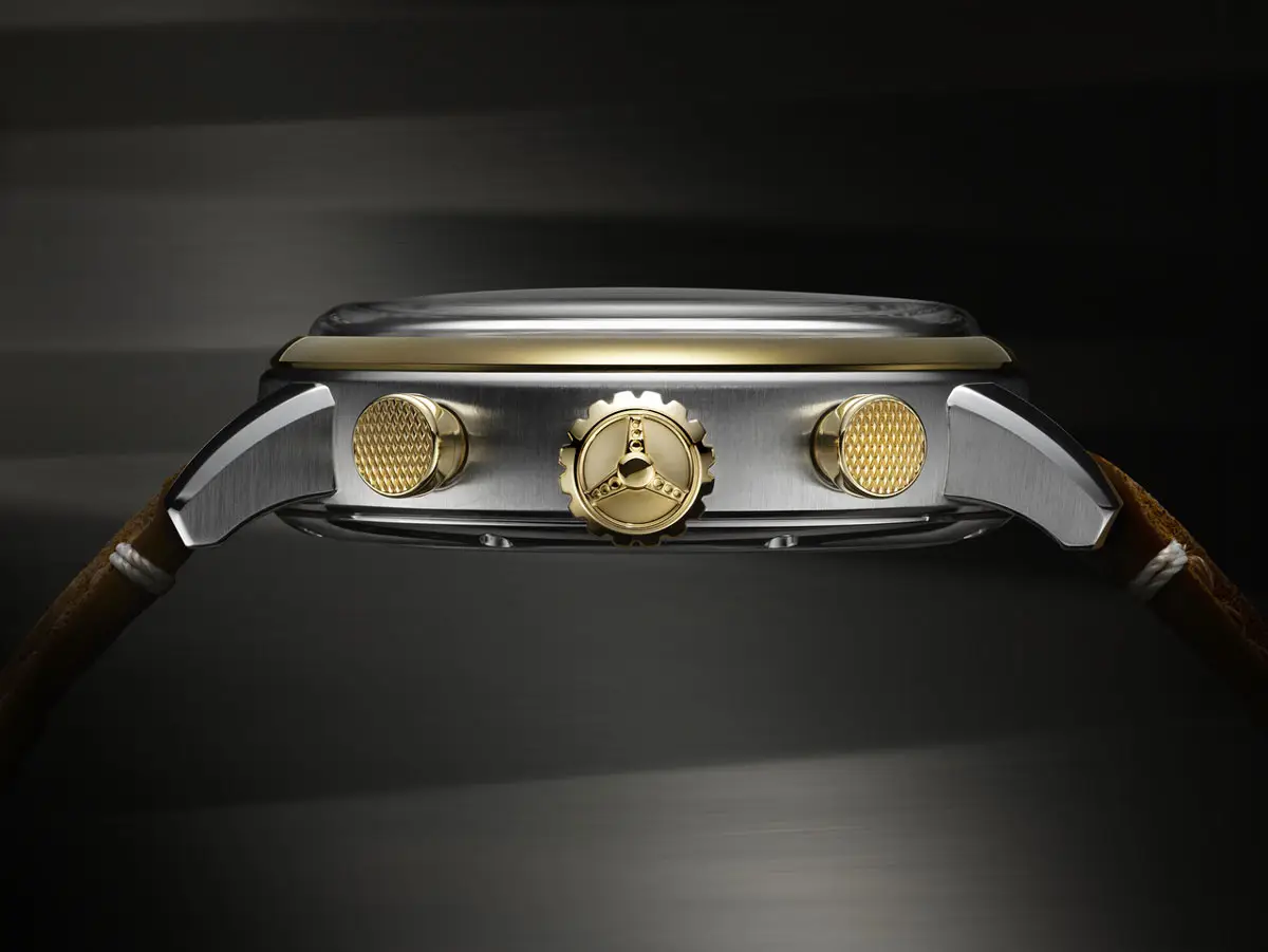 Mặt số màu xanh hiển thị rõ ràng thời gian cùng các chức năng chronograph và lịch ngày. Dây da màu nâu kết hợp với khóa gài kiểu cổ điển, tạo nên phong cách đậm chất cổ điển và mạnh mẽ.