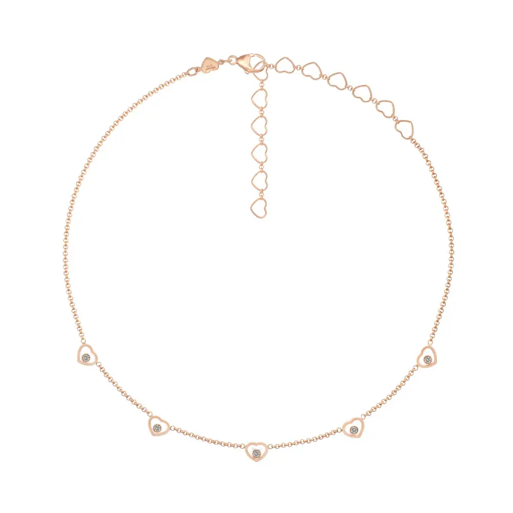 Chopard My Happy Hearts 81A088‑5501 là mẫu dây chuyền tinh tế và nữ tính, đến từ bộ sưu tập tôn vinh cảm xúc, sự tự do và vẻ đẹp mềm mại của phụ nữ. Thiết kế bằng vàng hồng 18K, điểm nhấn là năm trái tim nhỏ, mỗi trái tim đều chứa một viên kim cương chuyển động tự do giữa hai lớp kính sapphire – tạo nên hiệu ứng lấp lánh và đầy sống động.