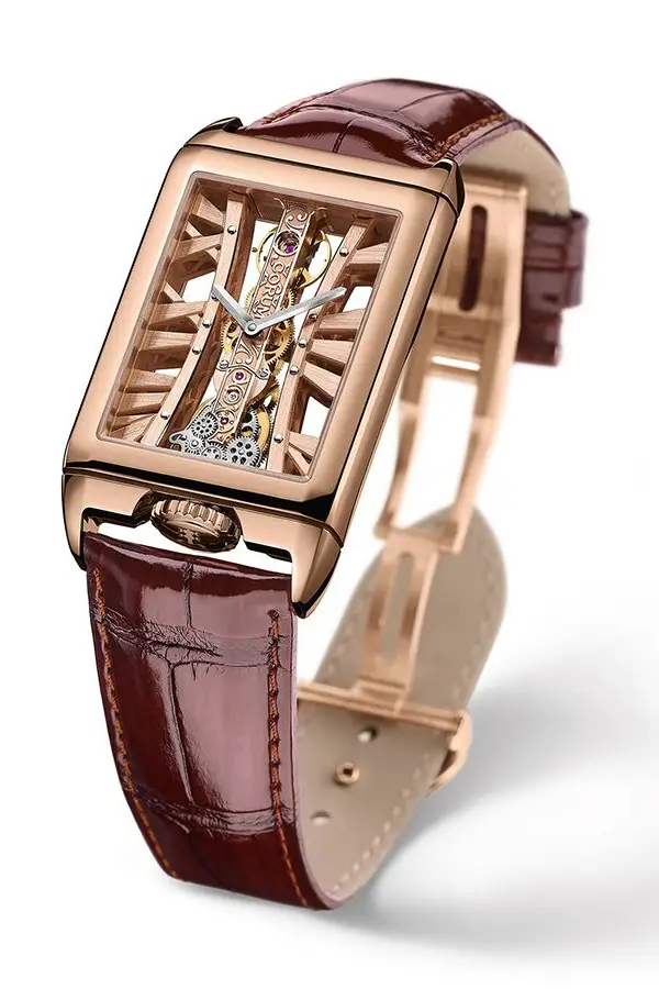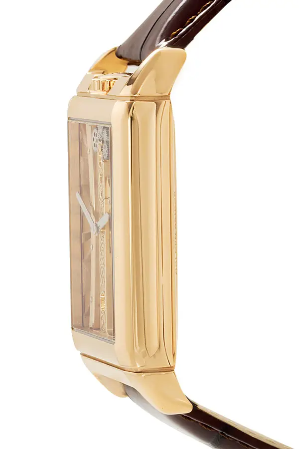 Vỏ hình chữ nhật thanh lịch, kích thước 42 × 29 mm, được chế tác từ vàng hồng 18kt sang trọng, mang lại diện mạo quý phái và tinh tế. Kính sapphire trước và sau phô diễn hoàn hảo cấu trúc cơ học bên trong và cho phép chiêm ngưỡng mặt số skeleton đặc trưng, biểu tượng của dòng sản phẩm mang tính biểu tượng này.