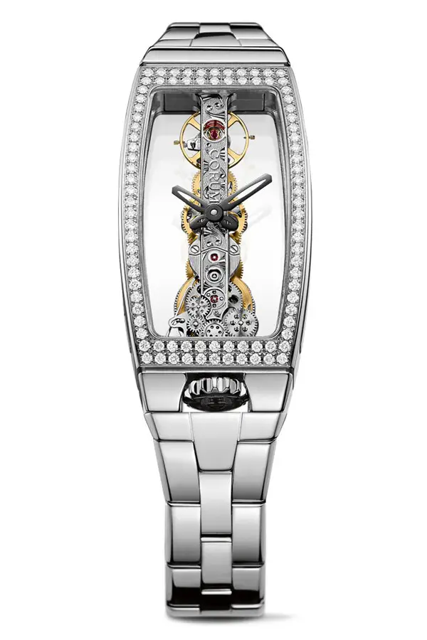 Đồng hồ nữ sang trọng của Corum dành cho những quý cô yêu thích phong cách tinh tế thuộc bộ sưu tập Golden Bridge. Dây đeo và vỏ đồng hồ được chế tác từ vàng trắng 18k, cùng với viền bezel cũng được làm từ chất liệu này và đính kim cương. Mặt số vuông màu tối gây ấn tượng với vô số chi tiết nhỏ được gia công tinh xảo.