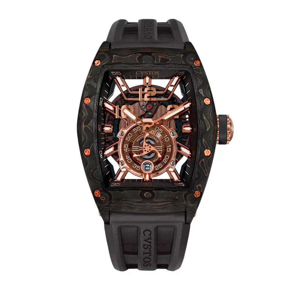 Chiếc Cvstos Jetliner PS 5N Carbon / Oro Carbon thể hiện sự hòa quyện hoàn hảo giữa vật liệu tiên tiến, kỹ thuật chính xác và phong cách hiện đại. Vỏ tonneau 53,7 × 41 mm làm từ sợi carbon kết hợp điểm nhấn vàng hồng 5N, vừa nhẹ, bền vừa mang nét sang trọng tinh tế.