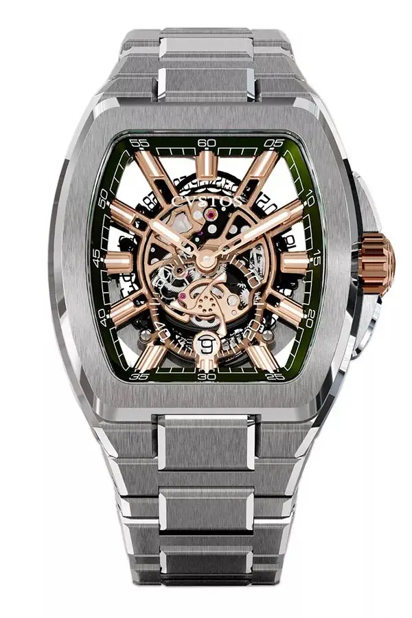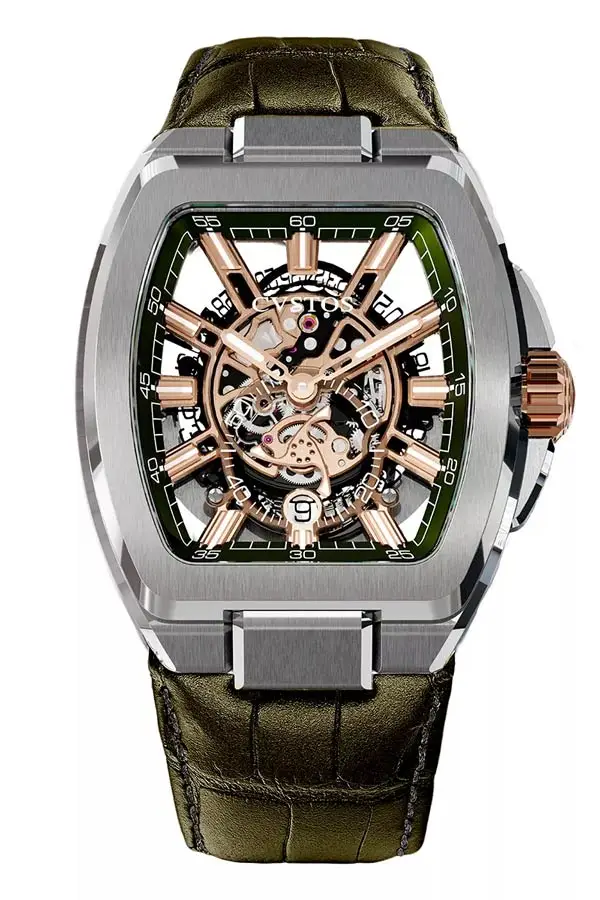 Với vỏ đồng hồ hình tonneau bằng titan kích thước 51 x 42 mm, đồng hồ vừa mạnh mẽ vừa nhẹ nhàng, mang lại sự bền bỉ và thoải mái khi đeo. Mặt kính sapphire bảo vệ mặt số skeleton màu vàng, cho phép chiêm ngưỡng bộ máy tự động CVS410 SQLT với dự trữ năng lượng khoảng 42 giờ.