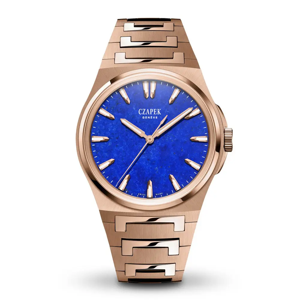 Đồng hồ Czapek Antarctique Mount Erebus Lapis Lazuli là sự kết hợp tinh tế giữa nghệ thuật chế tác haute horlogerie và vẻ đẹp tự nhiên. Mặt số làm từ đá lapis lazuli tự nhiên gây ấn tượng với sắc xanh sâu thẳm điểm xuyết các vệt pyrit ánh vàng, khiến mỗi chiếc đồng hồ trở nên độc nhất vô nhị. Vỏ vàng hồng 18K (5N) với đường kính 40,5 mm mang đến vẻ sang trọng, đồng thời giữ trọn tinh thần thể thao đặc trưng của bộ sưu tập Antarctique.