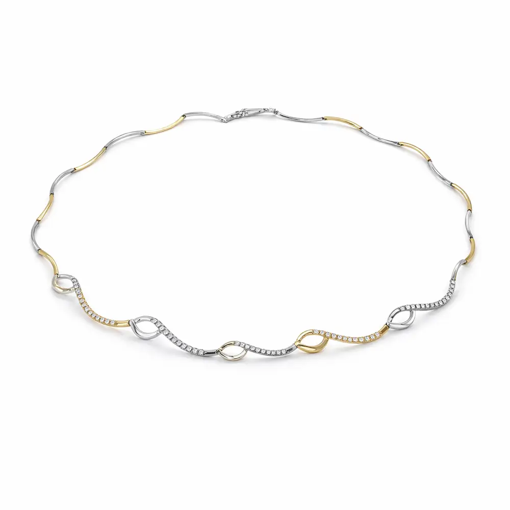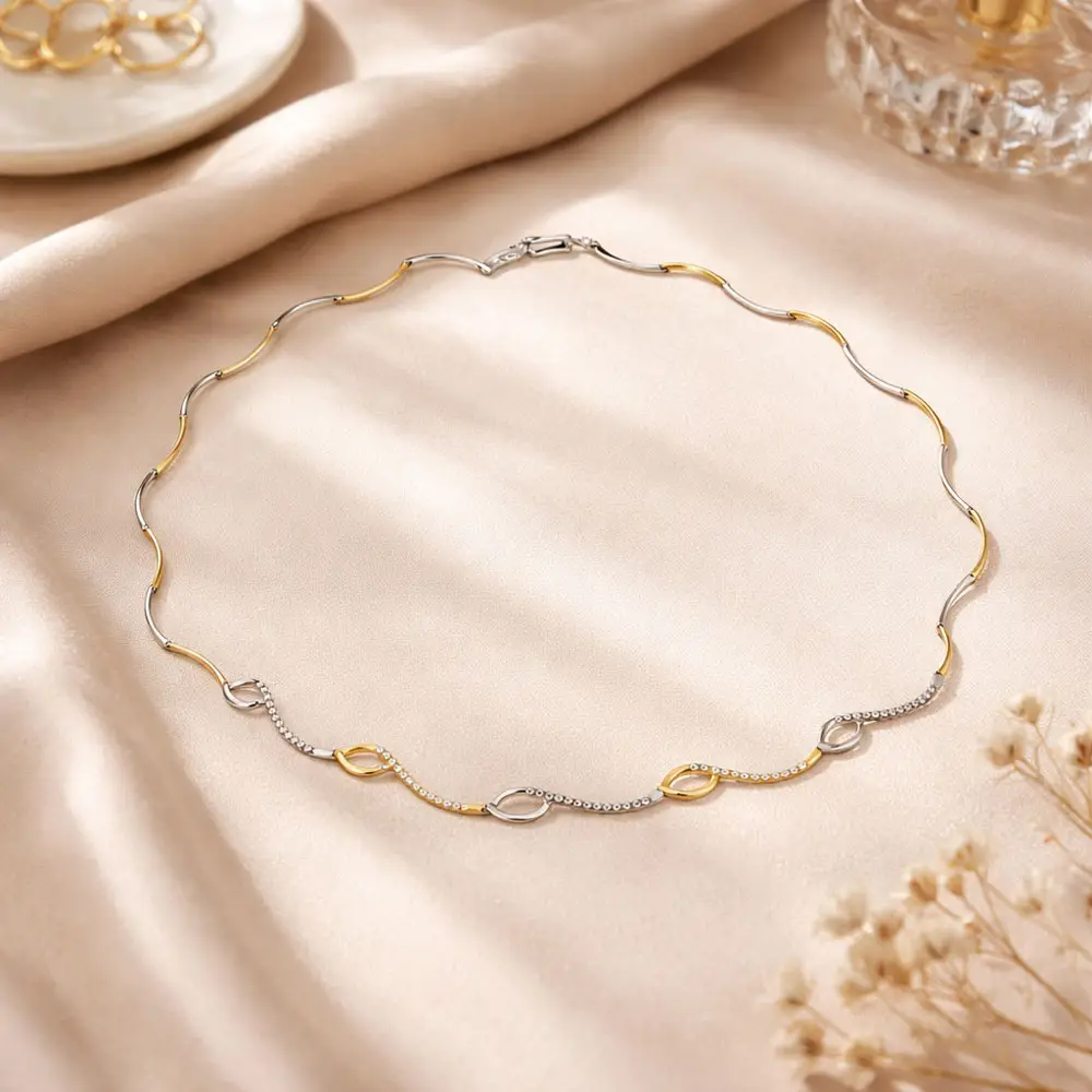 Chiếc dây chuyền bằng vàng kết hợp này gây ấn tượng với sự hòa quyện tinh tế giữa vàng vàng và vàng trắng, được điểm xuyết bằng những viên đá zirconia đính kết tỉ mỉ. Thiết kế mắt xích uốn lượn mềm mại mang lại vẻ đẹp hiện đại và thanh lịch, trong khi zirconia phản chiếu ánh sáng nhẹ nhàng, tôn lên nét sang trọng của trang sức.