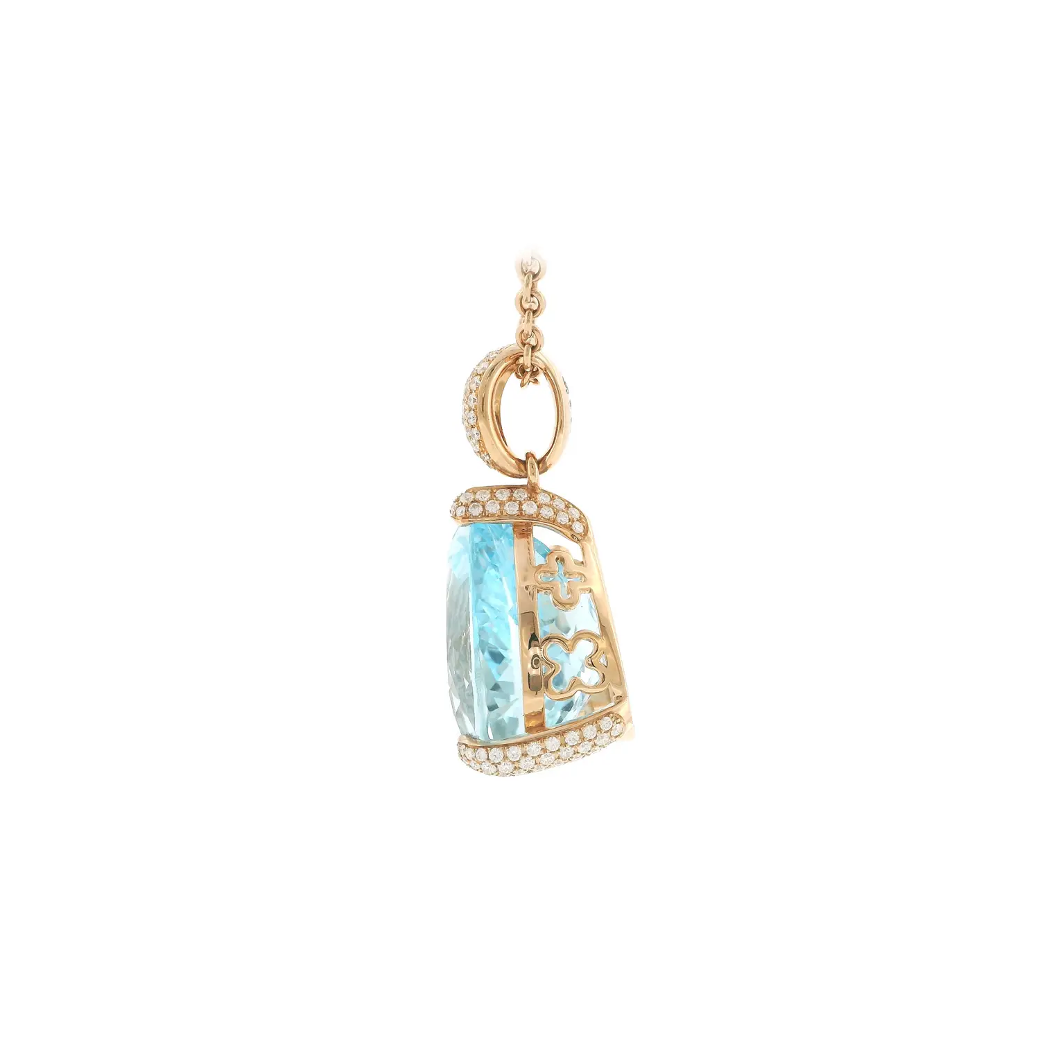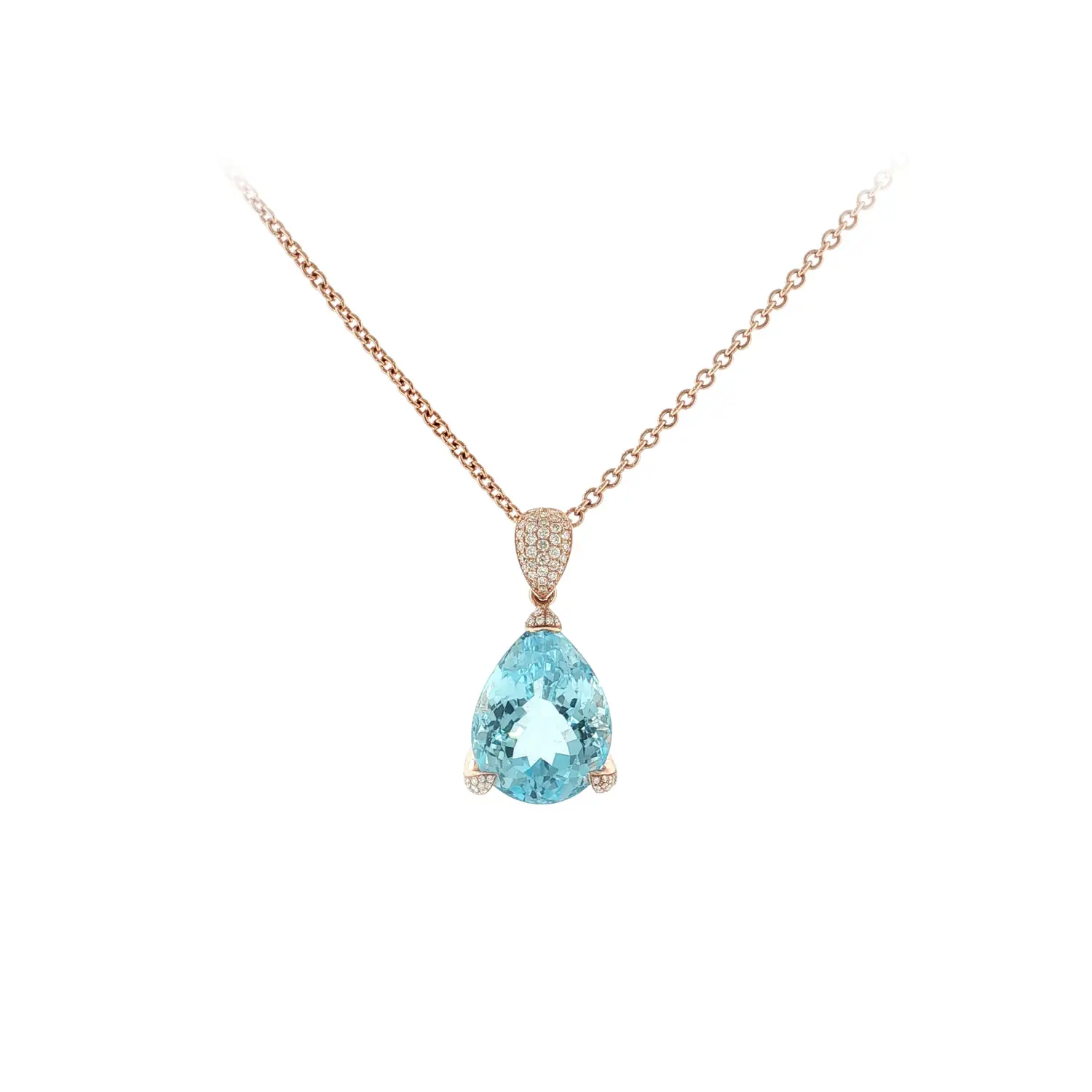 Chiếc dây chuyền cao cấp với đá topaz xanh và kim cương bằng vàng hồng là biểu tượng của sự sang trọng và tinh tế. Viên topaz xanh 52,66 ct nổi bật với độ trong suốt, ánh sáng rực rỡ và vẻ đẹp cuốn hút.