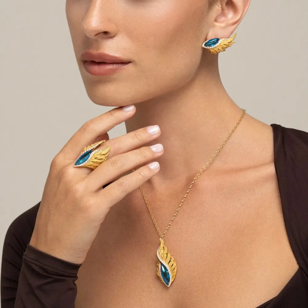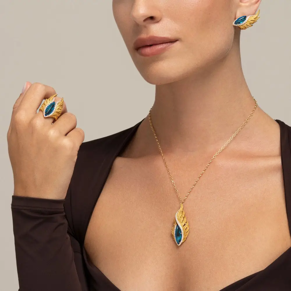 Điểm nhấn là viên topaz xanh 8,61 ct với độ sâu và độ sáng nổi bật. Kết hợp cùng 42 viên kim cương tổng 0,60 ct, tạo nên hiệu ứng lấp lánh sang trọng.