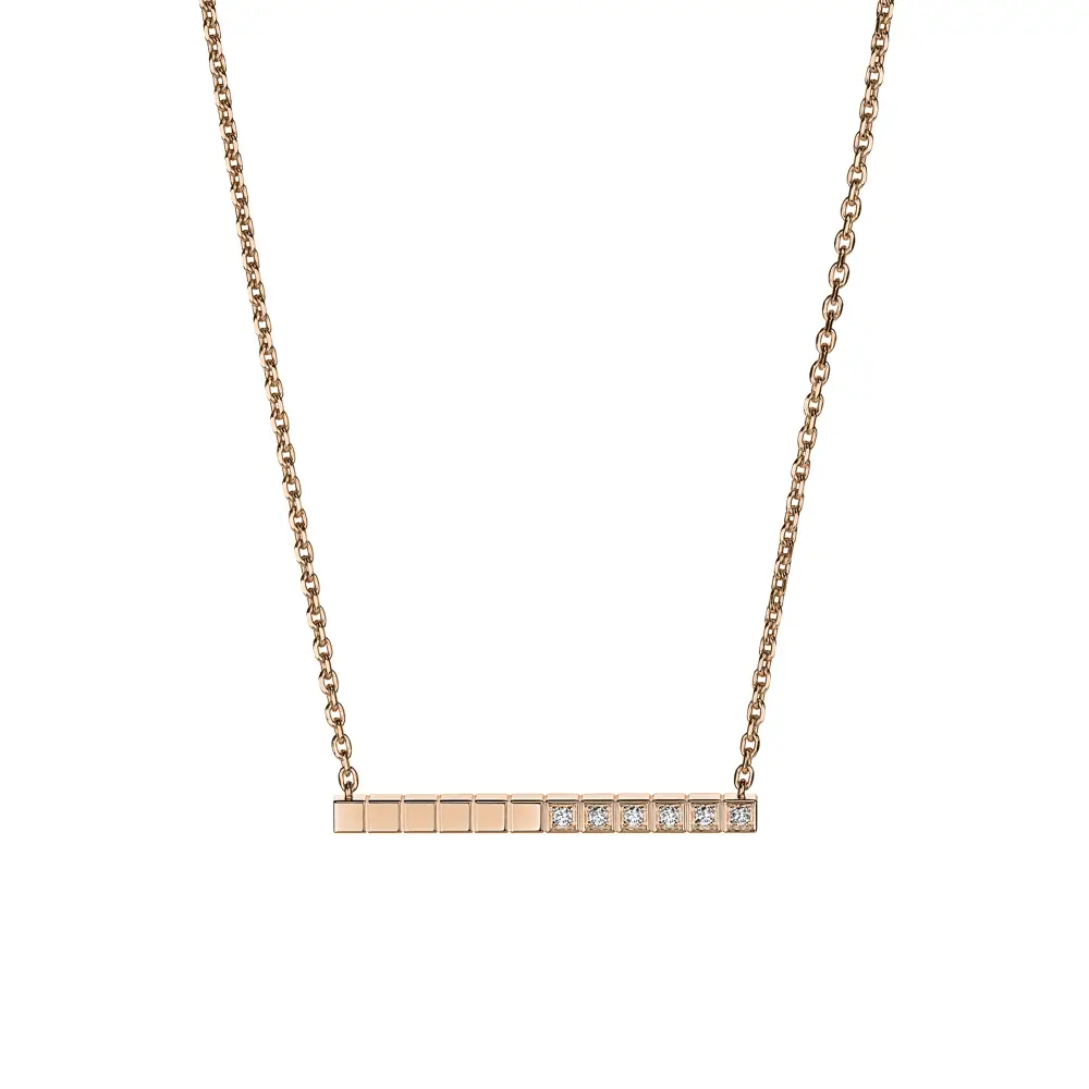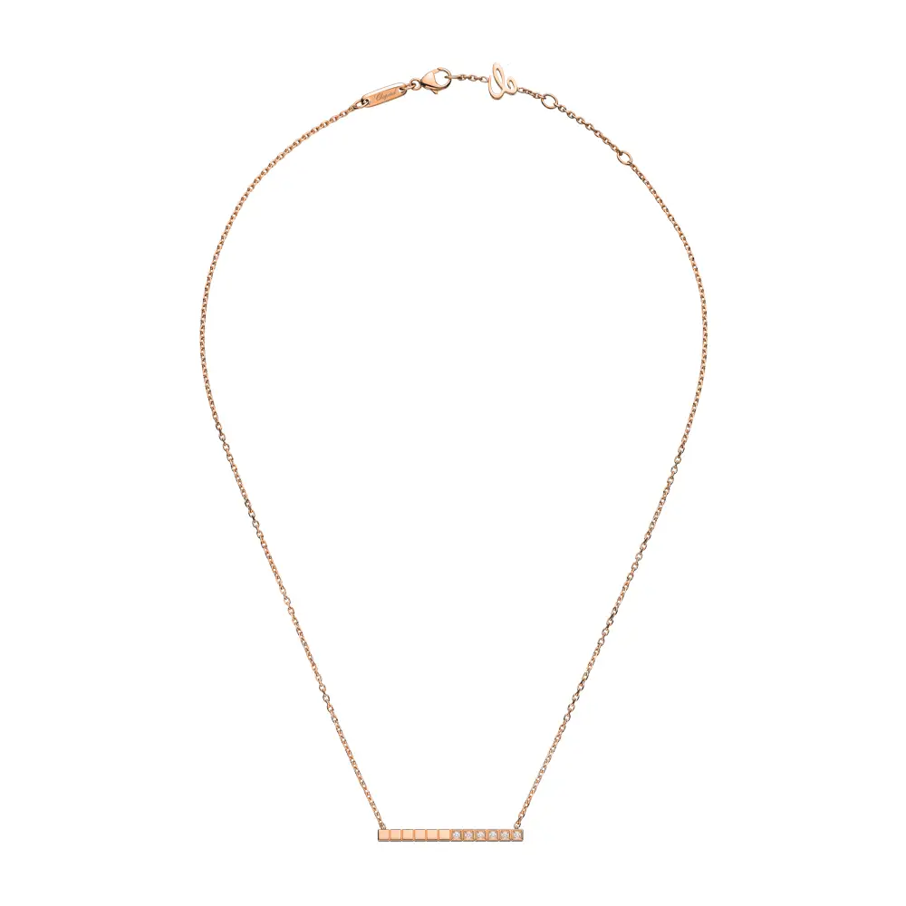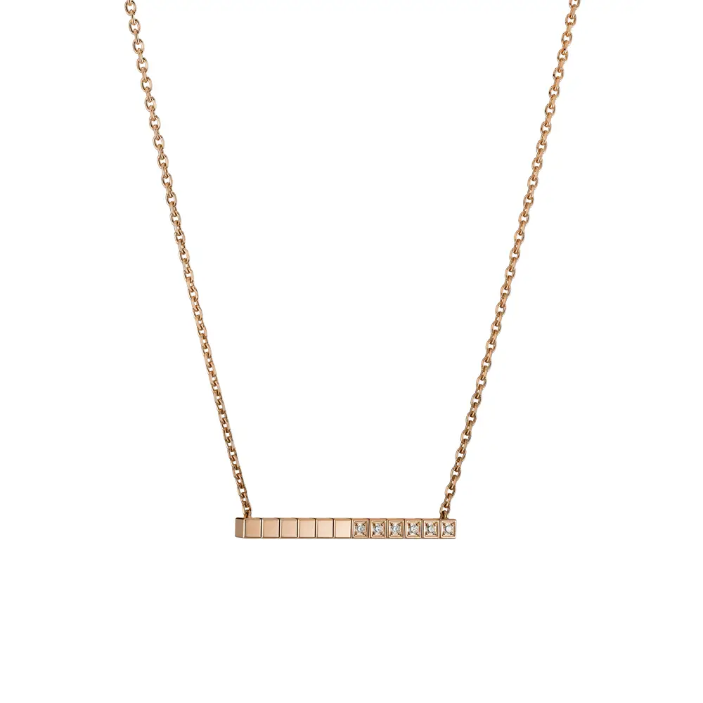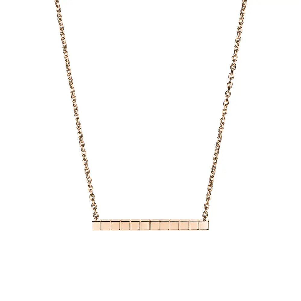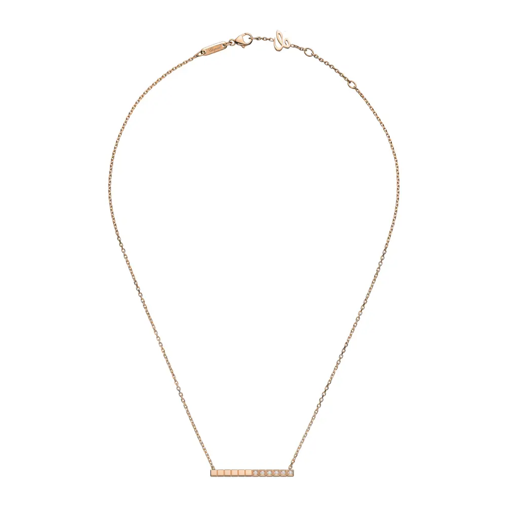 Chiếc dây chuyền Chopard Ice Cube 817702-5002 thể hiện vẻ thanh lịch tối giản và đường nét hình học tinh tế, đặc trưng của bộ sưu tập Ice Cube mang tính biểu tượng. Được chế tác từ vàng hồng 18K có nguồn gốc đạo đức, sắc ấm của kim loại tôn lên vẻ tinh xảo hiện đại.