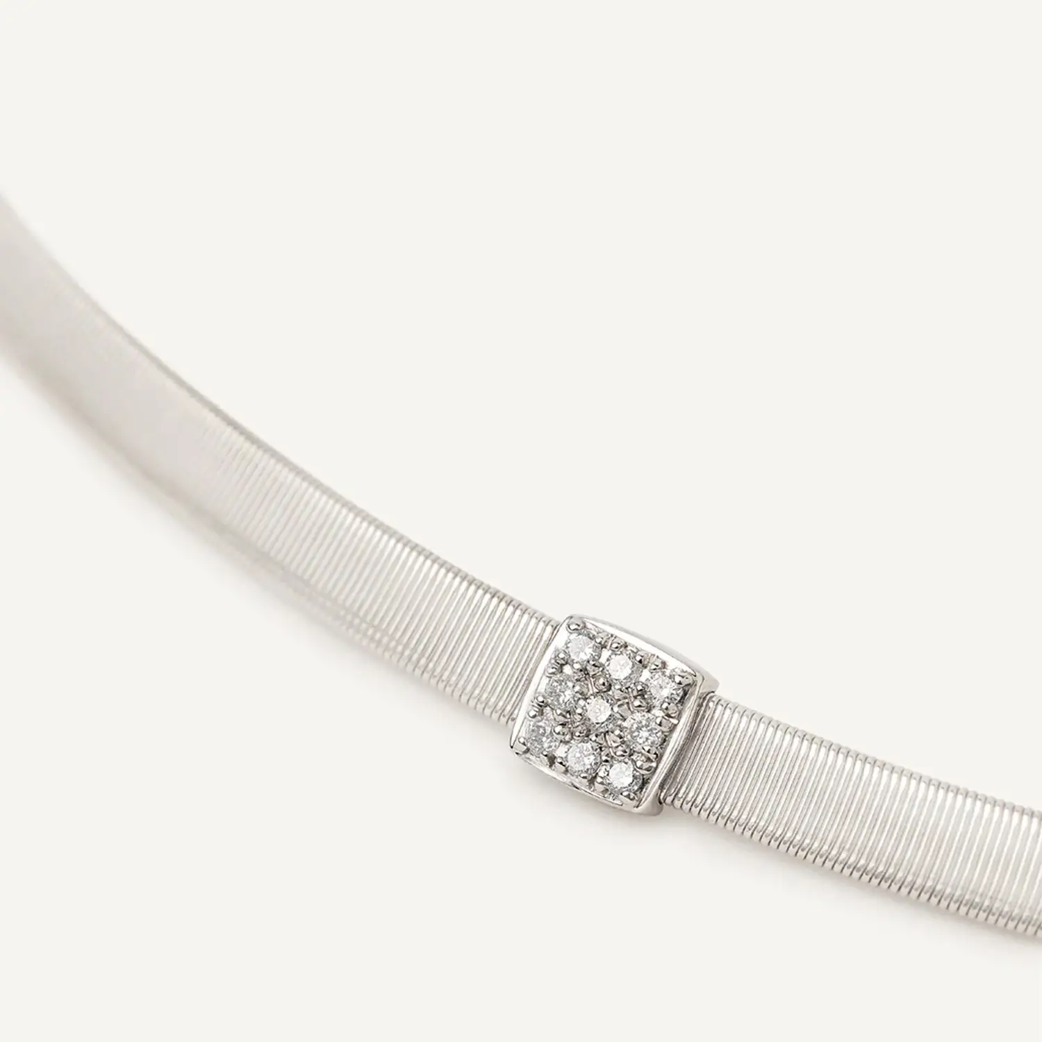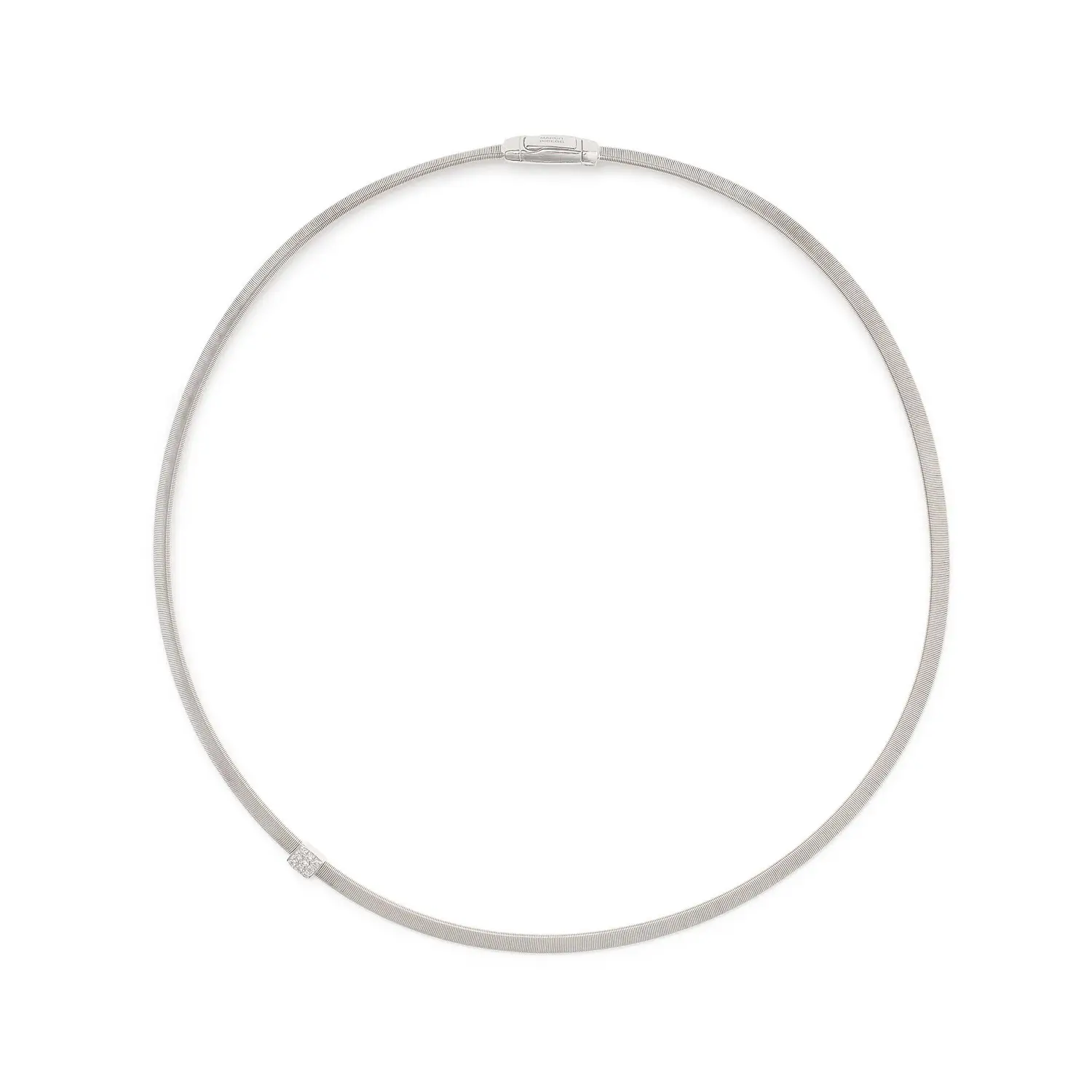 Chiếc vòng cổ sang trọng này thuộc bộ sưu tập Masai của Marco Bicego, thể hiện phong cách tối giản hiện đại và tinh tế Ý. Được chế tác từ vàng trắng 18 k, đính kim cương pavé tổng trọng lượng khoảng 0,07 ct, chiếc vòng toát lên vẻ đẹp thanh lịch mà tinh tế. Lấy cảm hứng từ văn hóa bộ tộc Masai, thiết kế mang hơi thở mạnh mẽ, tự do và thuần khiết.