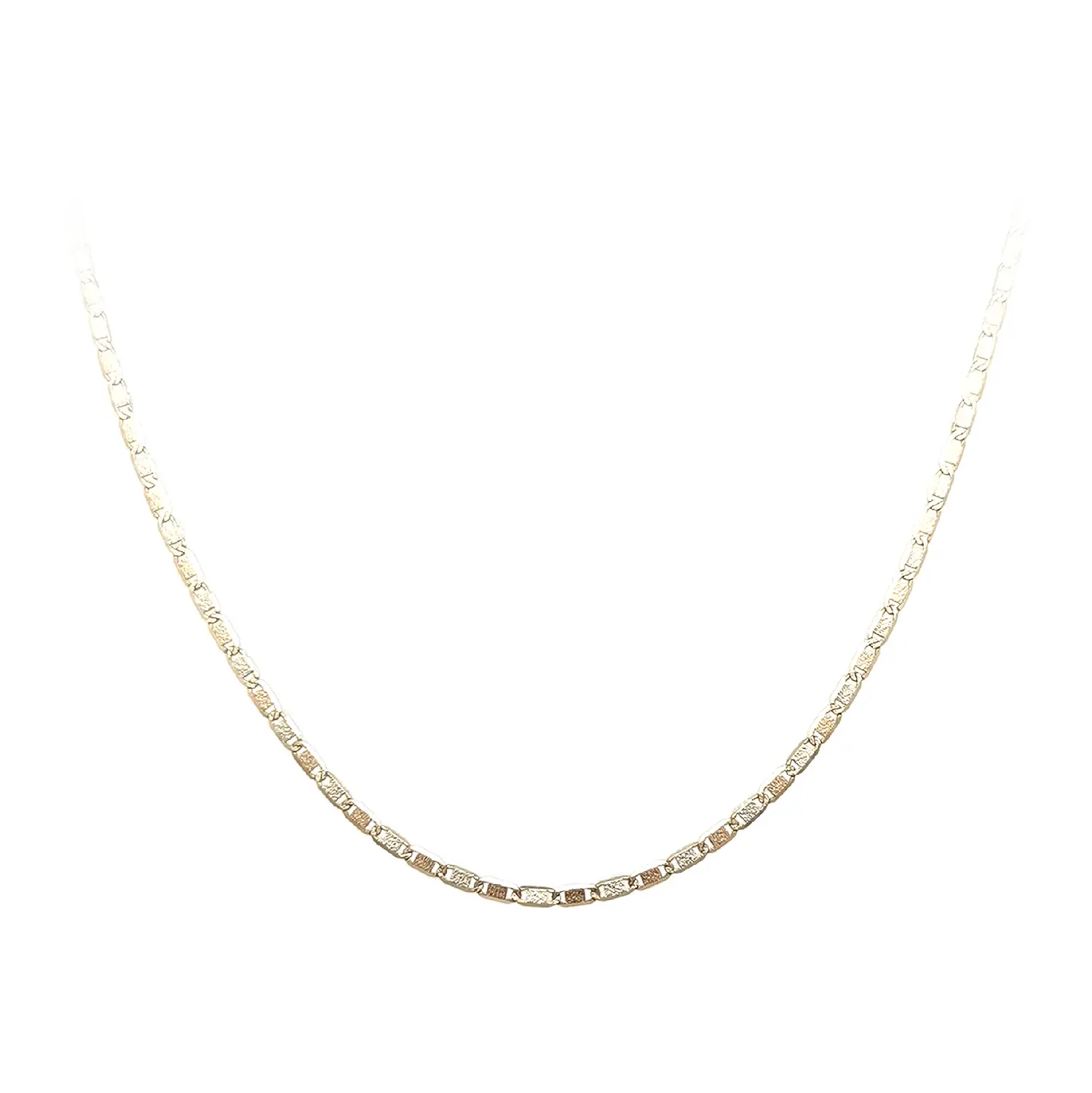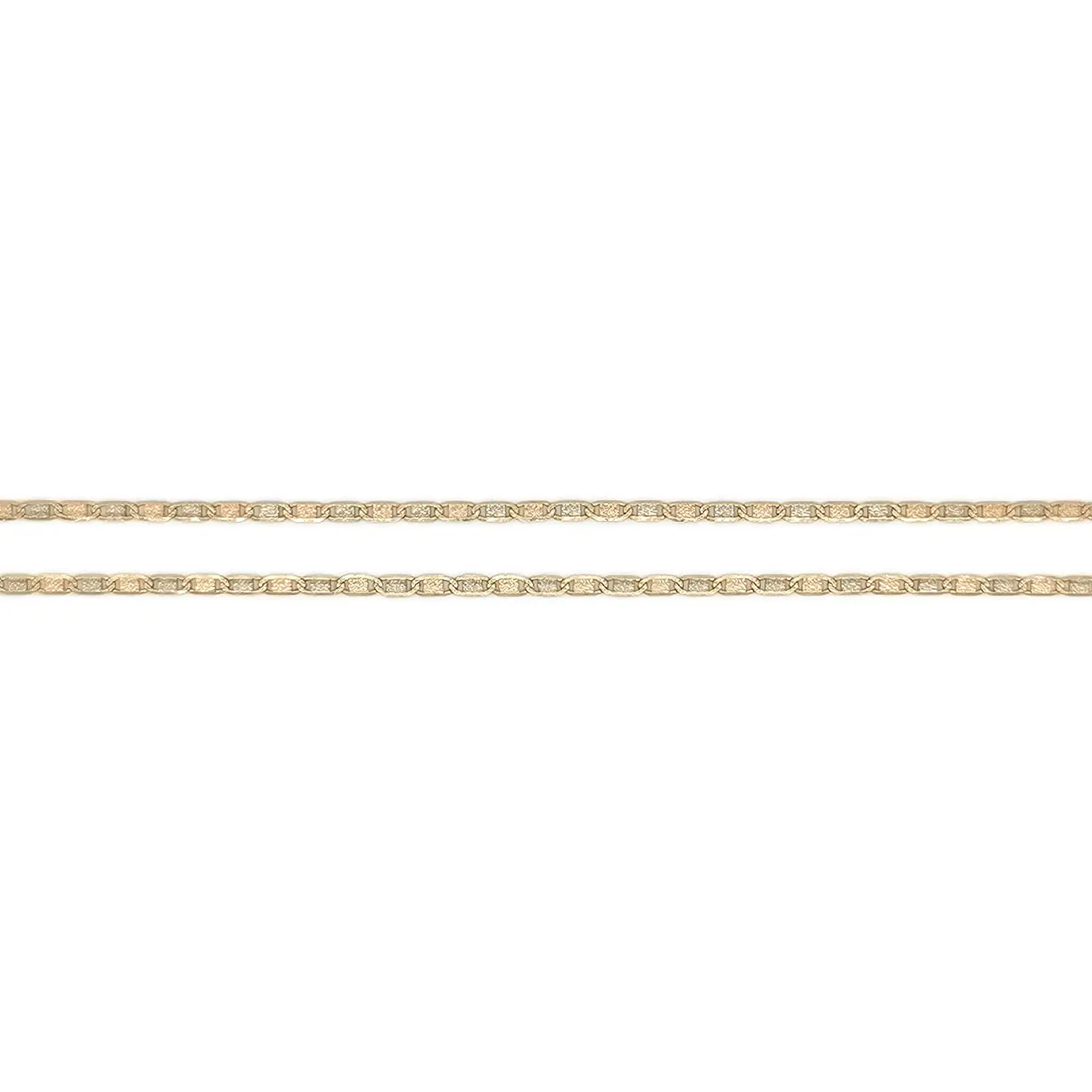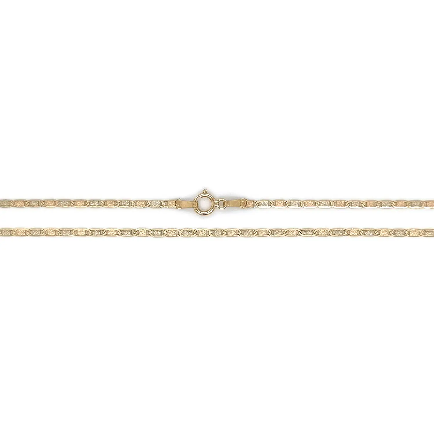 Sợi dây chuyền razor hai tông vàng thanh lịch này nổi bật với các mắt xích thon dài được cắt gọt tinh xảo, tạo nên vẻ ngoài đặc trưng và độ sáng rực rỡ. Sự kết hợp hai sắc vàng mang lại chiều sâu và sự tinh tế, phù hợp cho cả phong cách nữ và nam.