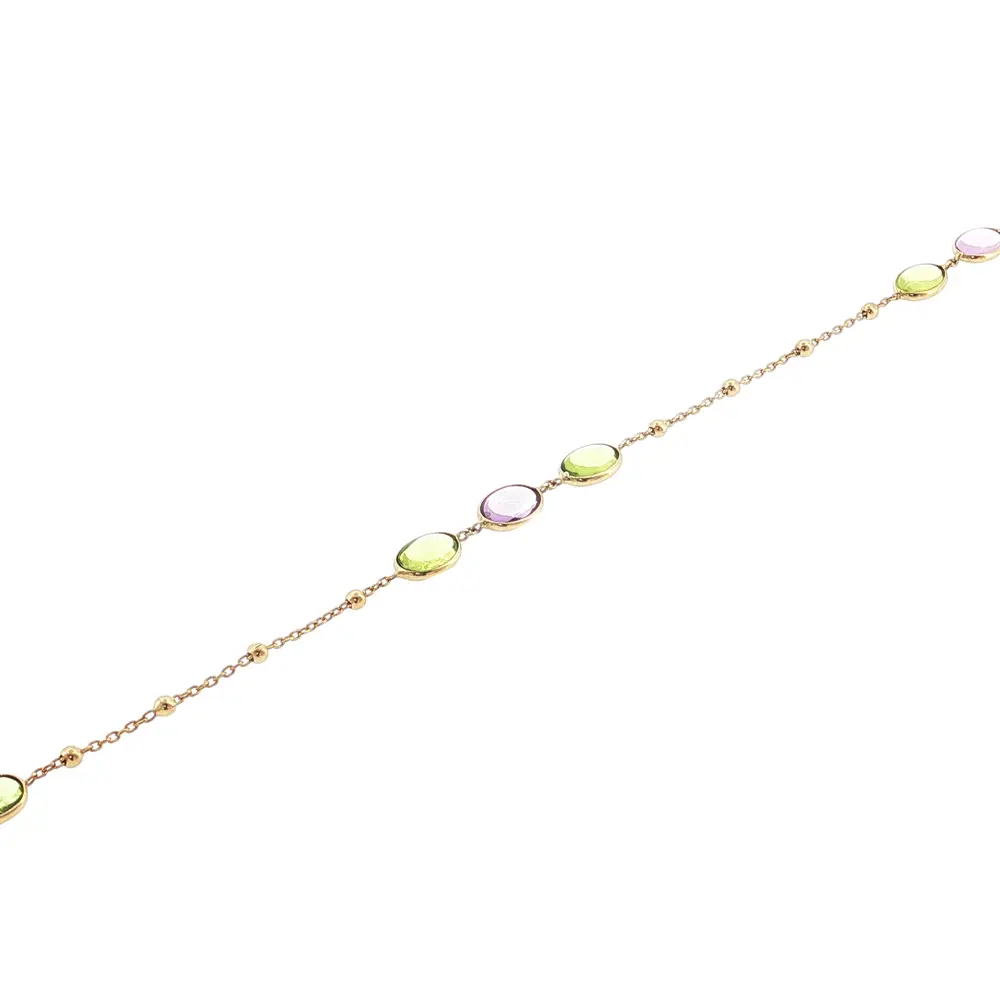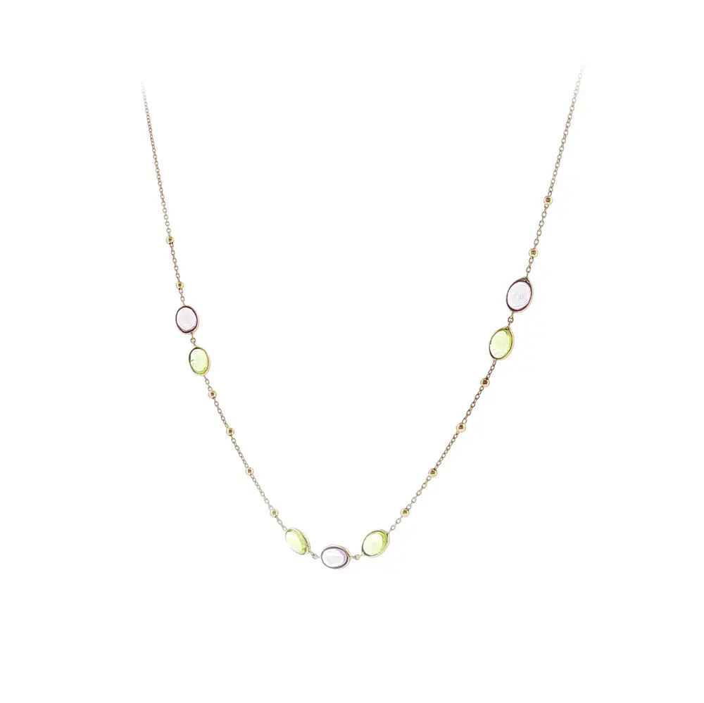 Chiếc dây chuyền vàng 14K (585) thanh lịch với đá màu tinh tế nổi bật nhờ thiết kế vượt thời gian và nhẹ nhàng. Tông màu pastel mang đến vẻ ngoài tươi mới, hiện đại, phù hợp cho cả trang phục hàng ngày lẫn những dịp đặc biệt. Thiết kế tối giản giúp tôn lên vẻ đẹp tự nhiên của người phụ nữ.