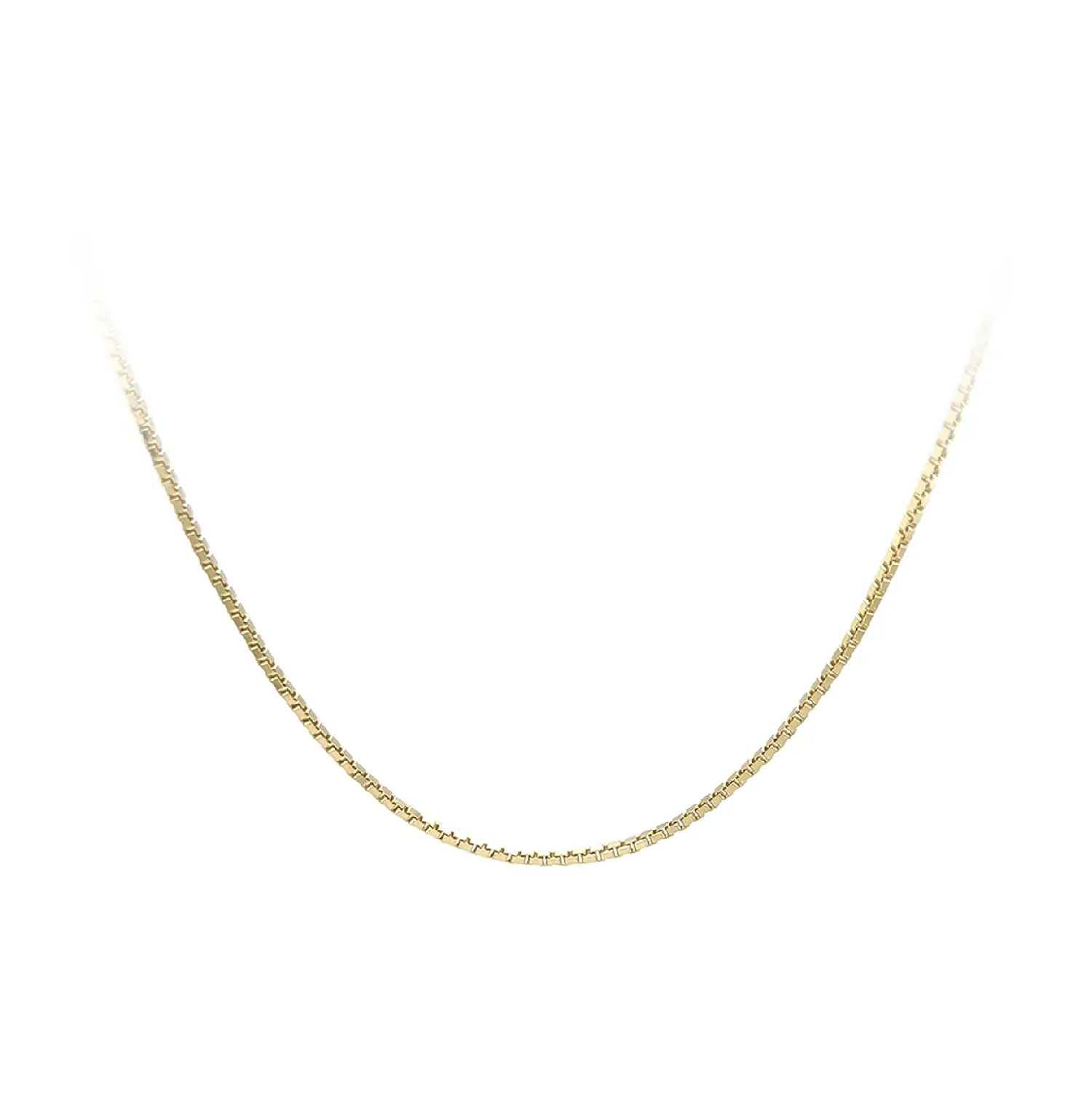 Dây chuyền Box nổi bật nhờ cấu trúc tinh xảo từ các mắt xích vuông nhỏ, tạo nên đường nét mượt mà và ánh sáng hình học tinh tế. Thiết kế tối giản mang lại vẻ đẹp hiện đại, dễ dàng phù hợp với phong cách hằng ngày hoặc kết hợp cùng các trang sức khác. Độ rộng 0,80 mm giúp dây trông thanh mảnh và sang trọng.
