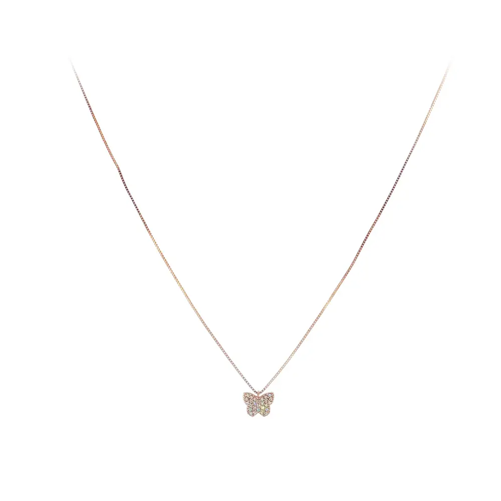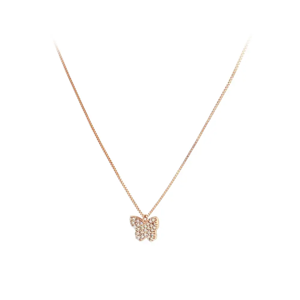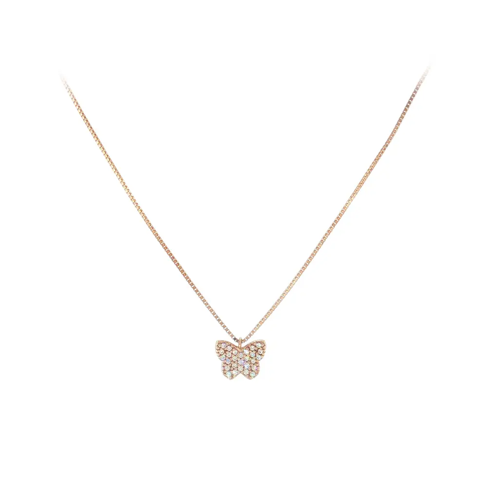 Chiếc dây chuyền vàng hồng thanh lịch với họa tiết bướm nổi bật với thiết kế tinh tế và chế tác tỉ mỉ. Mặt dây được đính đá zircon lấp lánh, phản chiếu ánh sáng đẹp mắt, mang lại vẻ sang trọng phù hợp cho cả ngày thường và dịp đặc biệt.