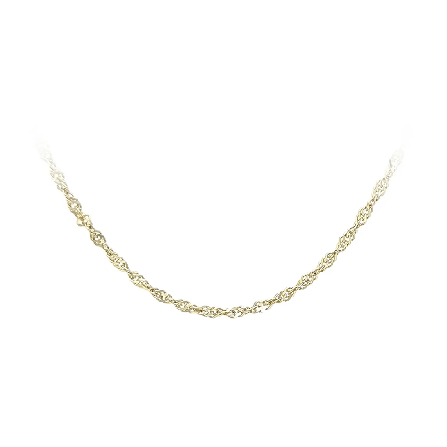 Dây chuyền vàng kiểu Singapore nổi bật với thiết kế xoắn tinh tế, giúp phản chiếu ánh sáng đẹp mắt và mang lại vẻ ngoài sang trọng. Phiên bản này có chiều dài 50 cm và bề rộng 1,50 mm, tạo cảm giác cân đối và thanh lịch.
